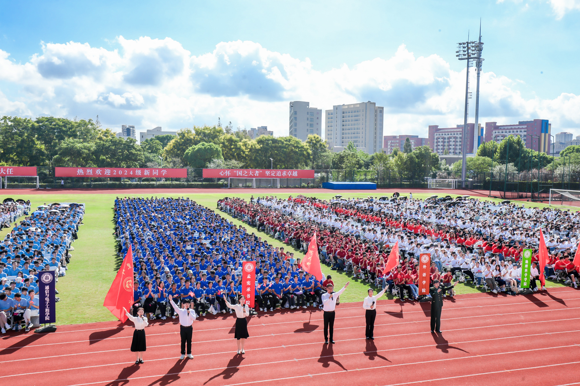 开学典礼在激昂的国歌声中拉开序幕,全体新生起立向国旗行注目礼,用青春的声音向祖国深情告白,乘着荣光开启新的人生篇章。