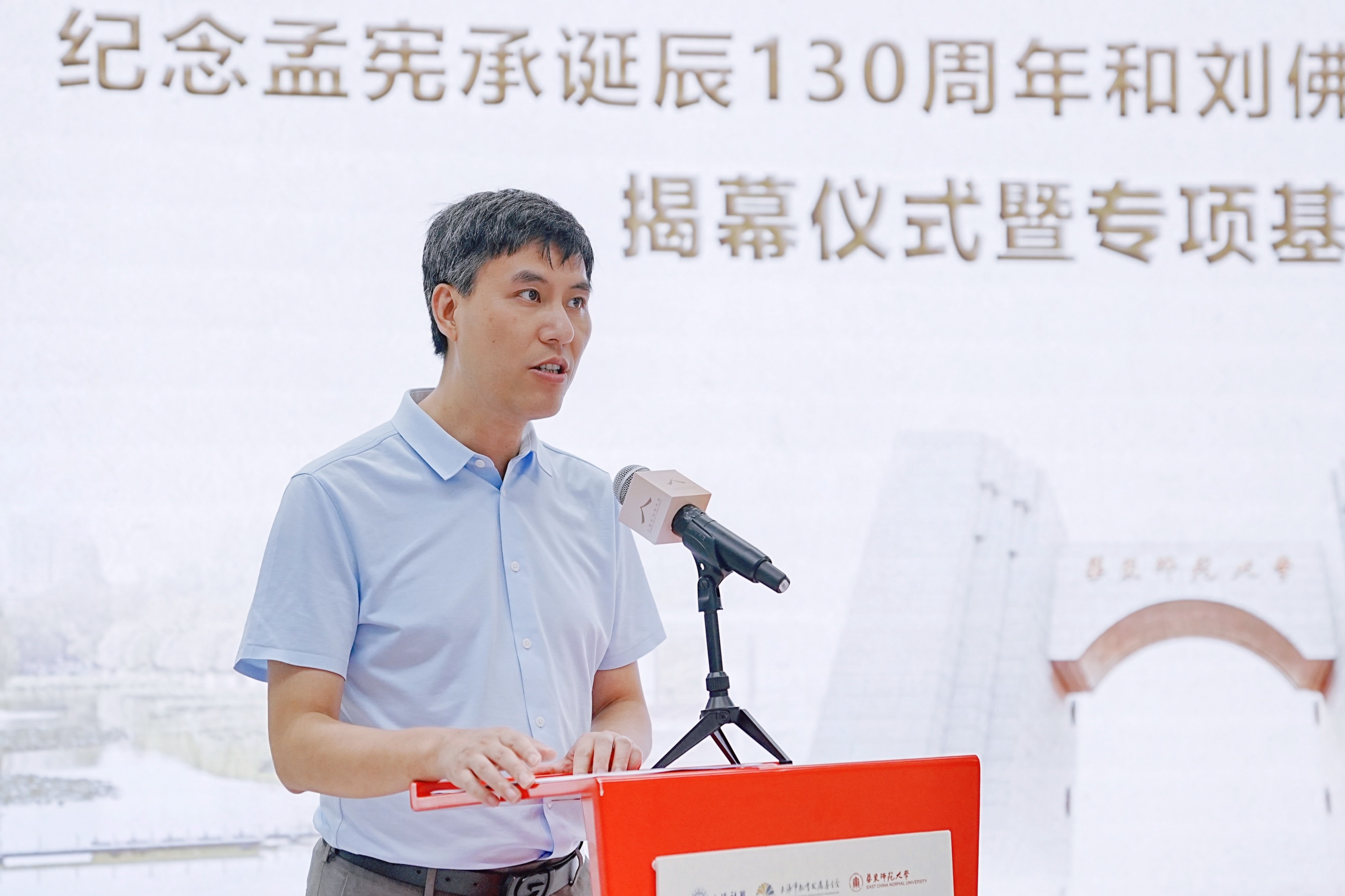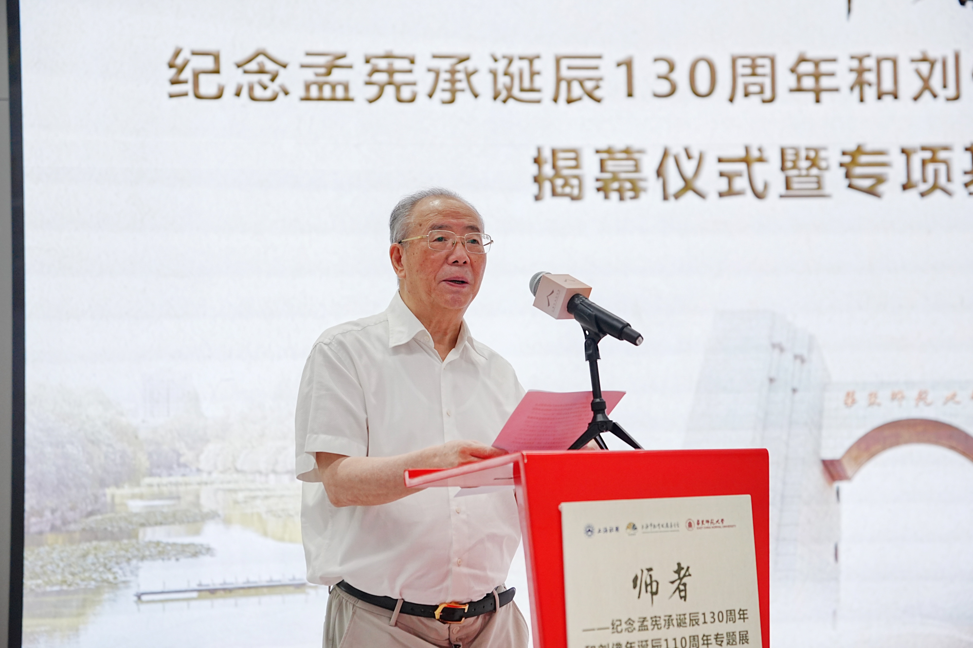 上海市教育发展基金会理事长王荣华、副理事长蒋红,上海市社会科学界联合会党组书记、专职副主席王为松,专职副主席任小文,华东师大党委书记梅兵、教育学部主任袁振国,孟宪承家属孟冰纹等出席开幕式并为“师者——纪念孟宪承诞辰130周年和刘佛年诞辰110周年专题展”揭幕。