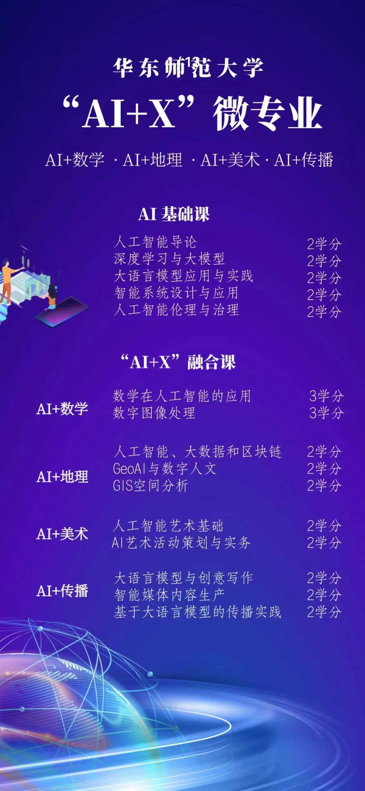 同时,学校积极推动人工智能与专业教育的深度融合,2024年起,面向全校本科生推出“AI+X”系列微专业,首批推出“AI+数学”“AI+地理”“AI+美术”“AI+传播”4个专业领域,共有来自29个专业的71名学生被选入,入选率为47%。