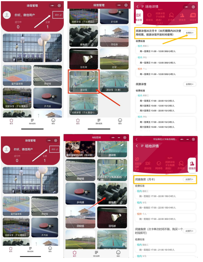 说明:月卡可通过澳门永利皇宫官网入口体育场馆管理系统小程序内“游泳馆月卡预约”或“健身房月卡预约”通道进行购买。月卡自办理日起有效期为30日。其中,游泳馆月卡有效期内可使用20次。健身房月卡有效期内不限使用次数,无论健身器械还是团操课程任你随意使用。