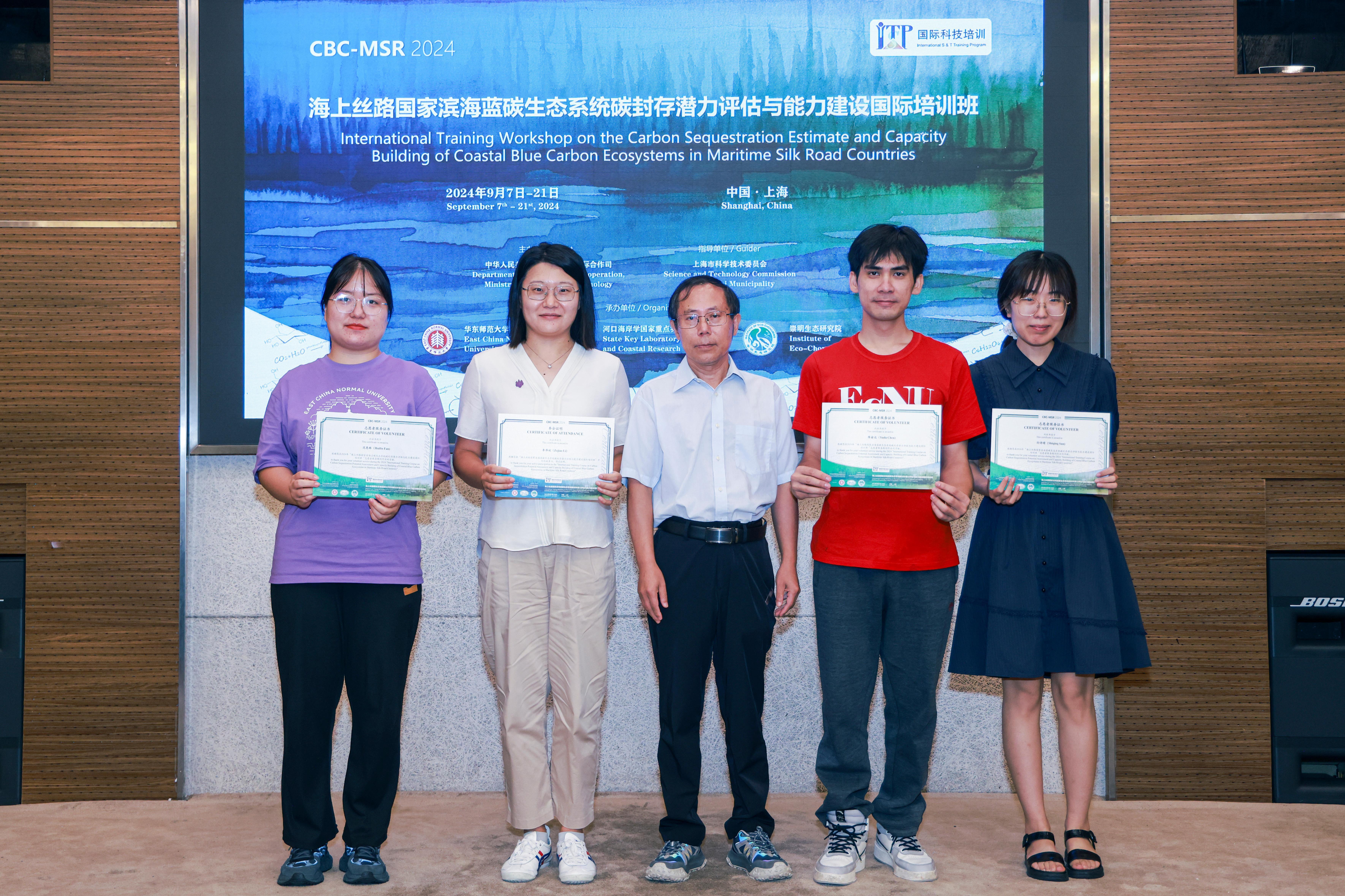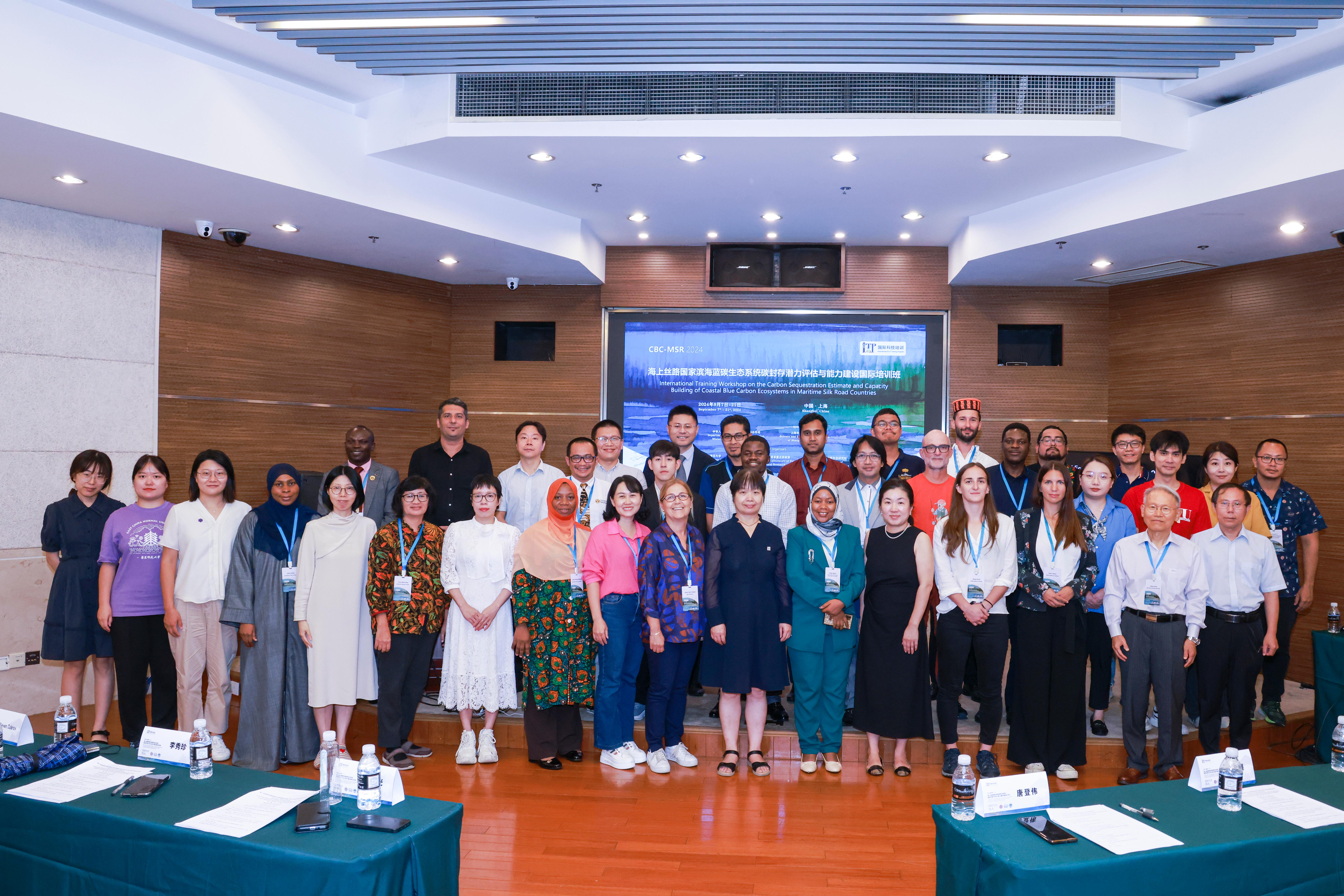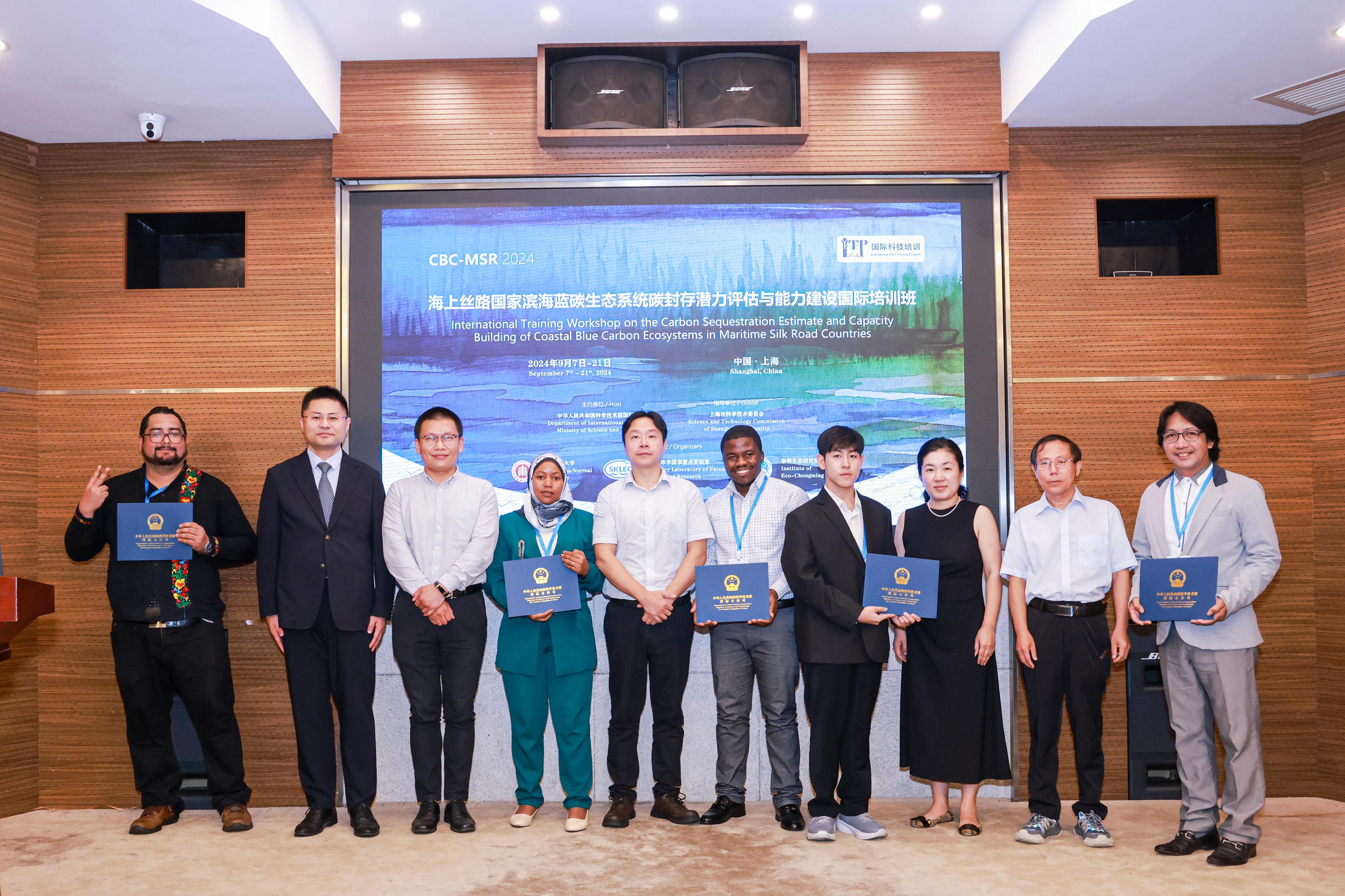 9月20日,由上海市科学技术委员会指导,澳门永利皇宫官网入口河口海岸学国家重点实验室与崇明生态研究院联合主办的“海上丝路”国家滨海蓝碳生态系统碳封存潜力评估与能力建设国际培训班(CBC-MSR)闭幕。来自非洲、拉丁美洲、南亚、上合组织成员国和东盟等“海上丝绸之路”重要节点13个国家的27名学员顺利结业。闭幕式上,上海科学技术交流中心国际合作交流处副处长唐登伟,上海市科学技术委员会科技合作处项目官员杨文展,澳门永利皇宫官网入口国际合作与交流处处长蒯曙光、科技处副处长王华、河口海岸科学研究院副院长李秀珍及河口海岸学国家重点实验室总工程师、培训班负责人杜金洲为学员颁发了结业证书、为志愿者颁发了服务证书。