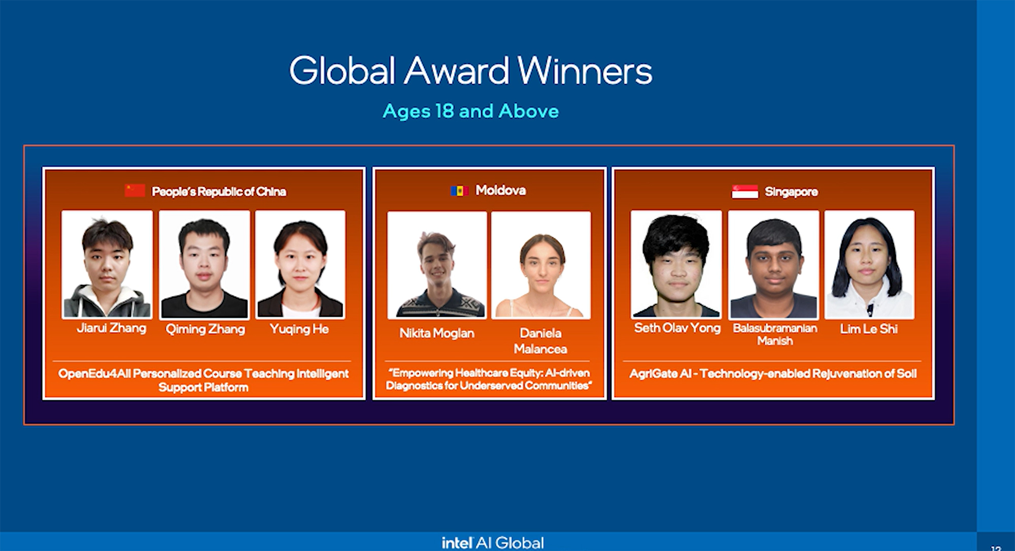 华东师大OpenEdu4All团队(左一)斩获2024年英特尔人工智能全球影响力嘉年华18岁以上年龄组全球大奖