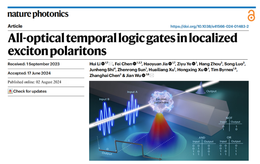 成果以All-optical temporal logic gates in localized exciton polaritons为题发表在Nature Photonics上。该工作的共同第一作者为澳门永利皇宫官网入口李辉研究员、已毕业博士陈飞和在读博士贾浩远,李辉研究员和吴健教授为共同通讯作者。