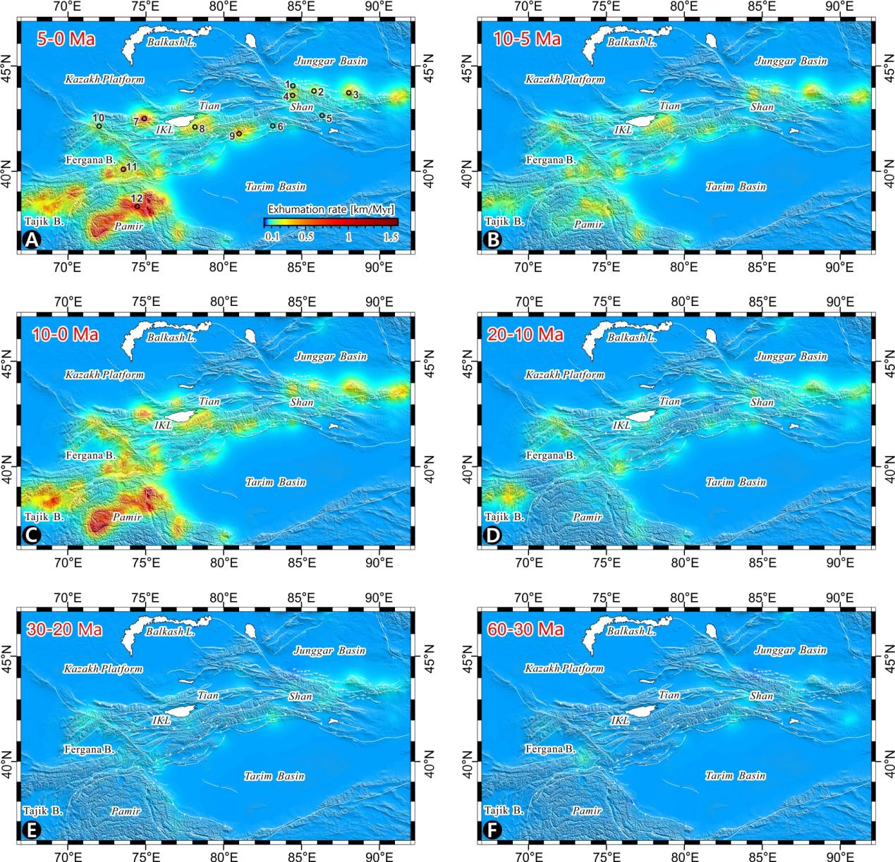 图为反演的天山及帕米尔高原北部新生代剥露速率的时空分布