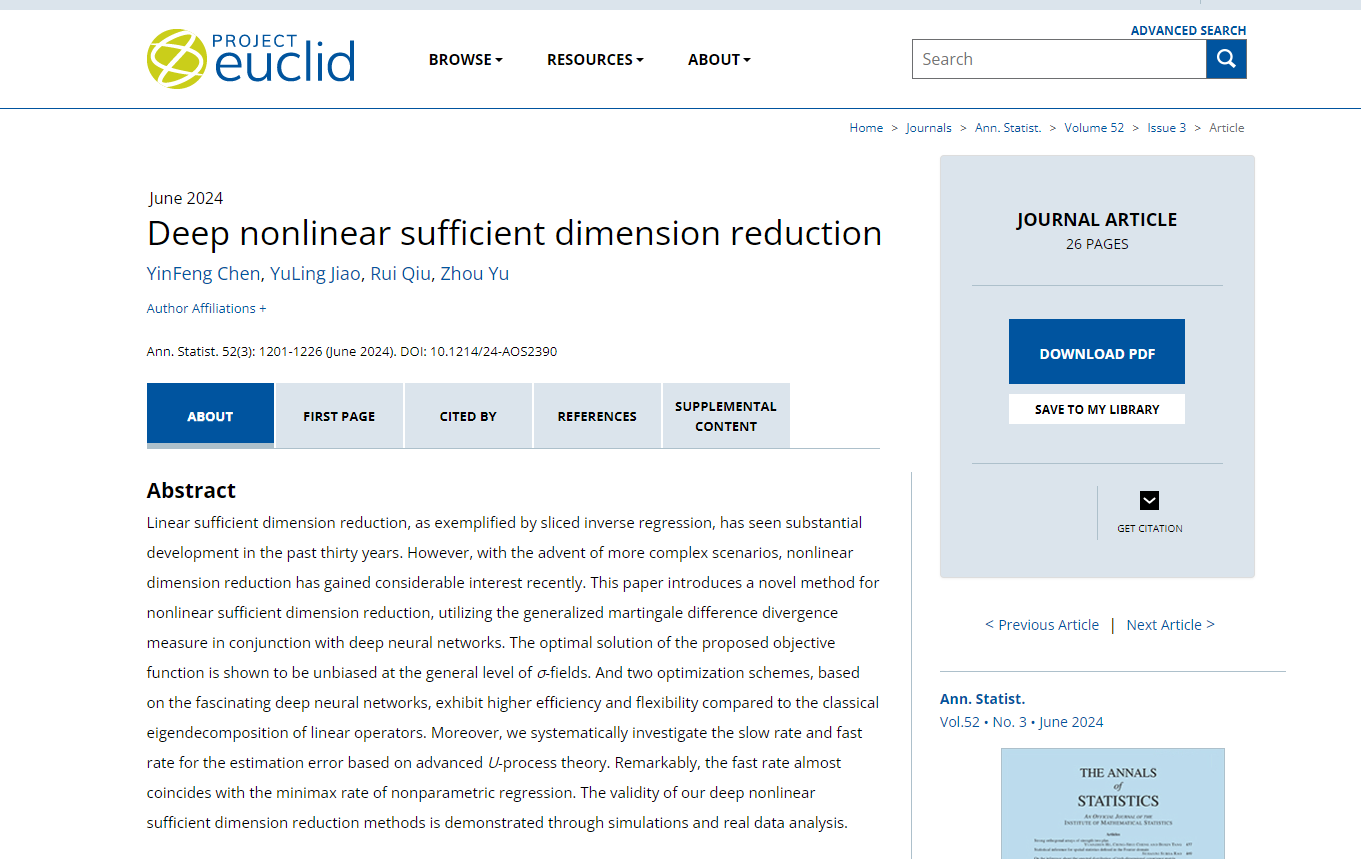 统计学院於州教授及其博士生陈胤峰、邱锐与武汉大学焦雨领副教授合作研究中,提出了基于神经网络的非线性充分降维方法,并成功应用于数据低维表示的估计。该方法通过借助广义鞅差散度刻画条件独立性,应用深度神经网络拟合非线性充分降维函数,并发展了有限阶U过程理论以深入探究估计量的非渐近收敛性质。与经典的算子特征分解相比,其提出的方法表现出更高的效率和灵活性。相关研究以Deep Nonlinear Sufficient Dimension Reduction为题发表在统计学期刊Annals of Statistics上。