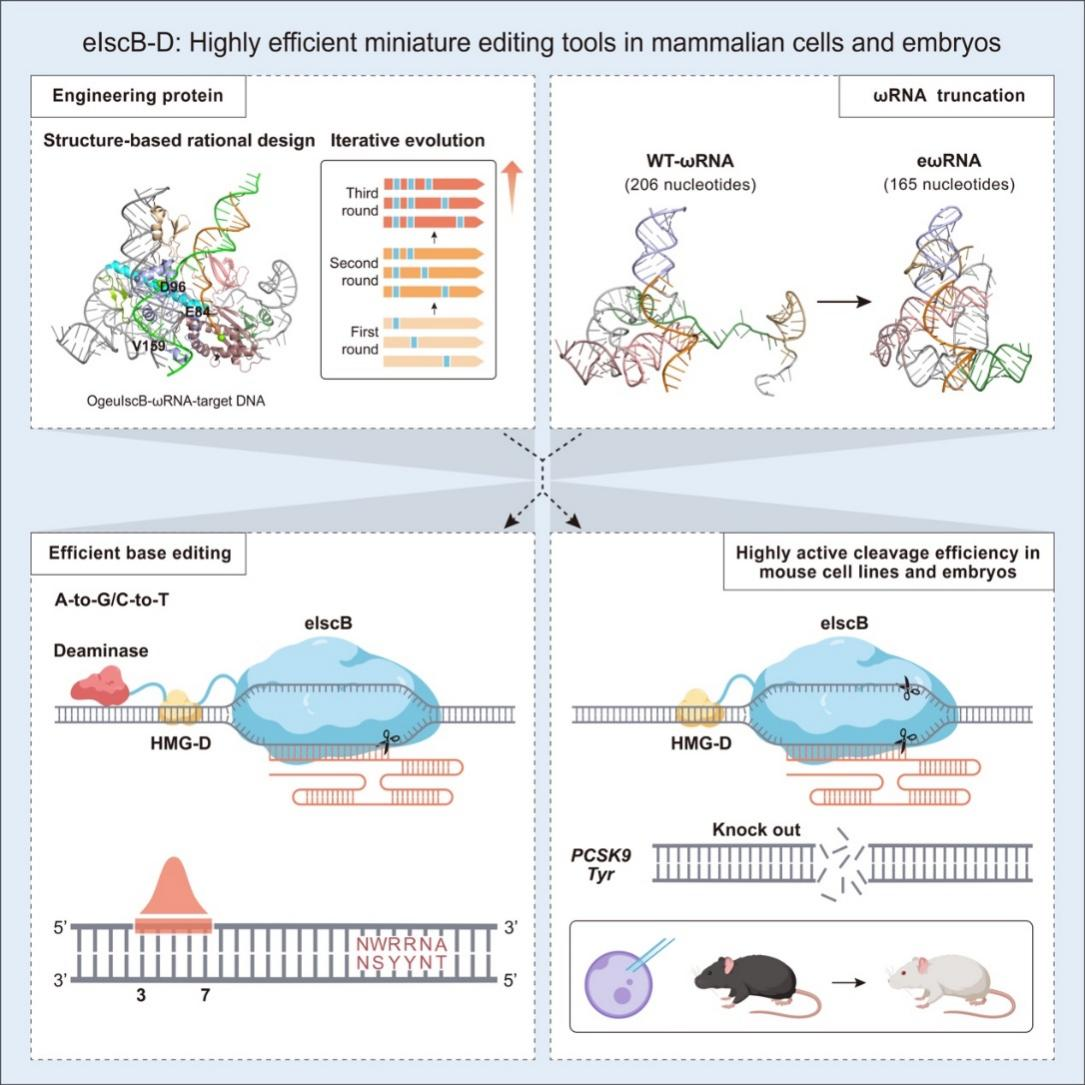 生命科学学院李大力研究员团队通过三轮氨基酸突变筛选,成功获得增强型IscB(eIscB)。eIscB相较于野生型IscB编辑效率最高可以提升22.4倍,平均编辑效率可提高7.5倍。此外,研究者通过融合一个非序列特异性DNA双链结合蛋白提高了IscB与目标DNA的亲和力,高活性IscB(eIscB-D)的最高编辑效率可达91.3%。在此基础上,研究者还针对向导RNA进行优化改造,获得高效ωRNA,在长度相较于野生型ωRNA缩短约20%的同时,编辑效率相比原始IscB/ωRNA平均提升20.2倍。研究还首次证明eIscB-D可通过胚胎注射高效制备疾病动物模型,具有高编辑活性,是一种极具临床应用潜力的编辑系统。