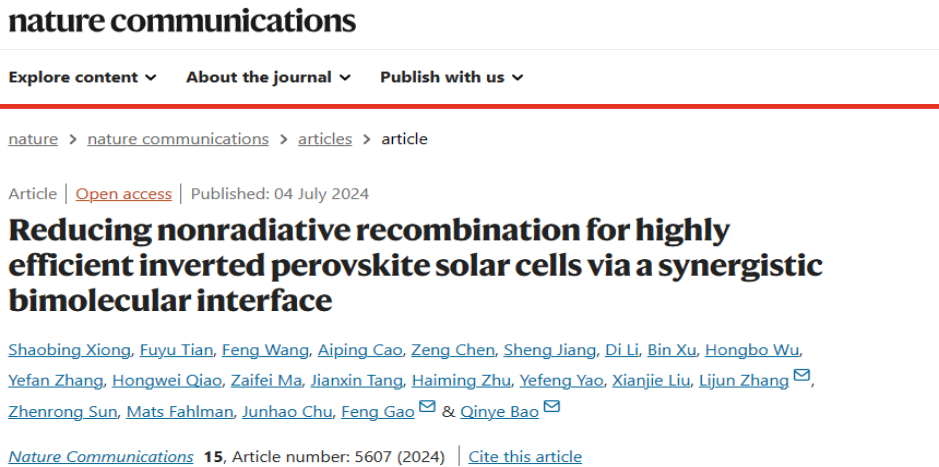 如何有效抑制半导体异质结非辐射复合是实现高性能光电器件的关键科学问题。针对该科学问题,物理与电子科学学院保秦烨教授课题组探索了卤化物半导体/有机半导体异质结的电子结构物性,提出了一种协同双分子(SBI)界面调控策略,构筑出具有优异载流子提取的异质结,并应用于模型器件钙钛矿光伏器件进行验证,创造了非辐射复合损失仅59 meV。该研究成果发表在Nature Communications上,并被选为Editors' Highlights,澳门永利皇宫官网入口为论文第一完成单位,保秦烨教授为论文通讯作者。