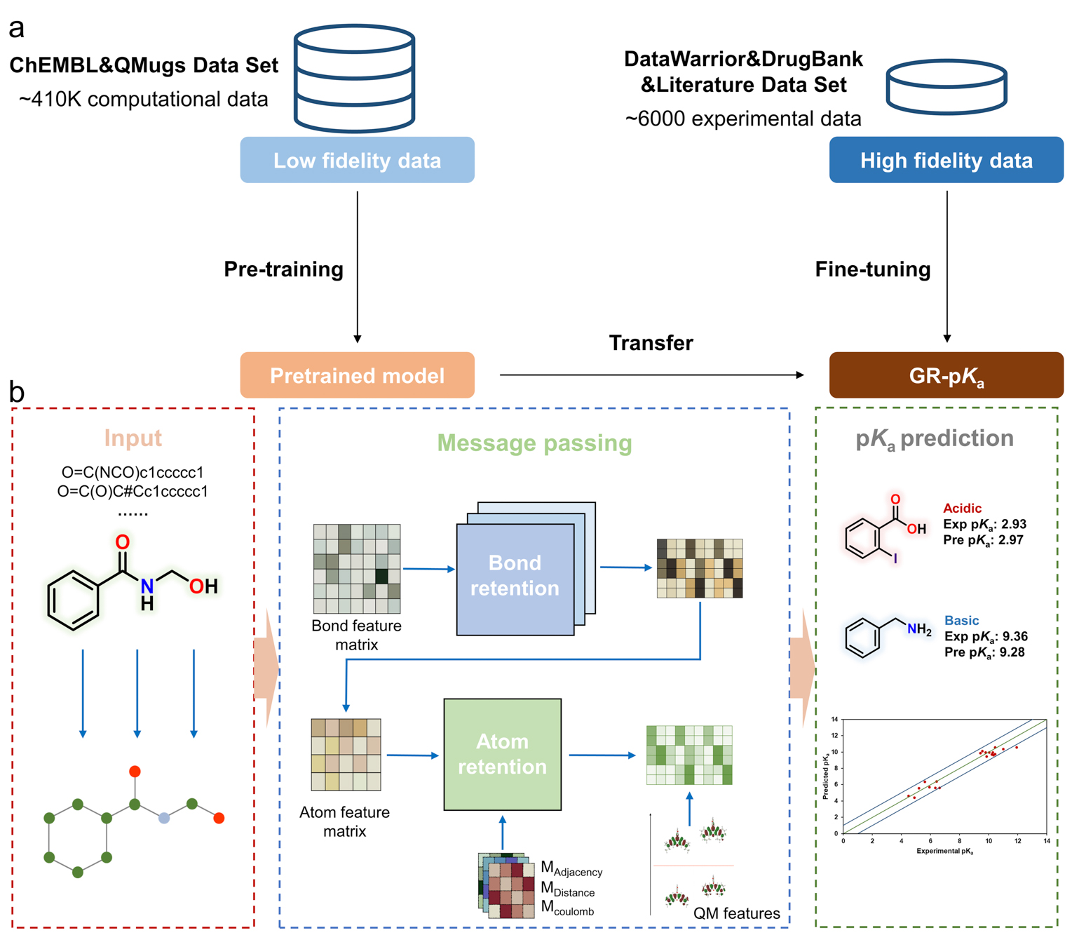 图为GR-pKa方法的概况图。a: GR-pKa的多重保真度学习策略。b: GR-pKa的模型框架。