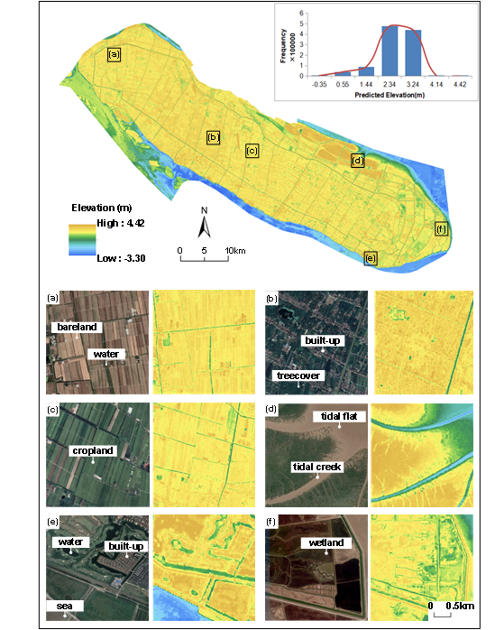 河口海岸学国家重点实验室谭凯副研究员联合湖南科技大学、武汉大学科研团队,融合ICESat-2激光雷达测高、Sentinel-1 合成孔径雷达和 Sentinel-2多光谱影像三种免费公开卫星遥感数据,基于随机森林机器学习模型构建 ICESat-2光子点高程与 Sentinel-1 & Sentinel-2 中和土地覆盖相关的极化特征、纹理特征、光谱特征及指数特征的映射关系,研发了一种多土地覆盖类型下的空间连续大尺度海岸带地形高程反演方法,该方法不依靠任何现场实测数据和潮位数据,仅依靠卫星数据实现高浑浊浅水和茂盛植被覆盖潮滩的10 m空间分辨率和cm级高程精度的地形反演。