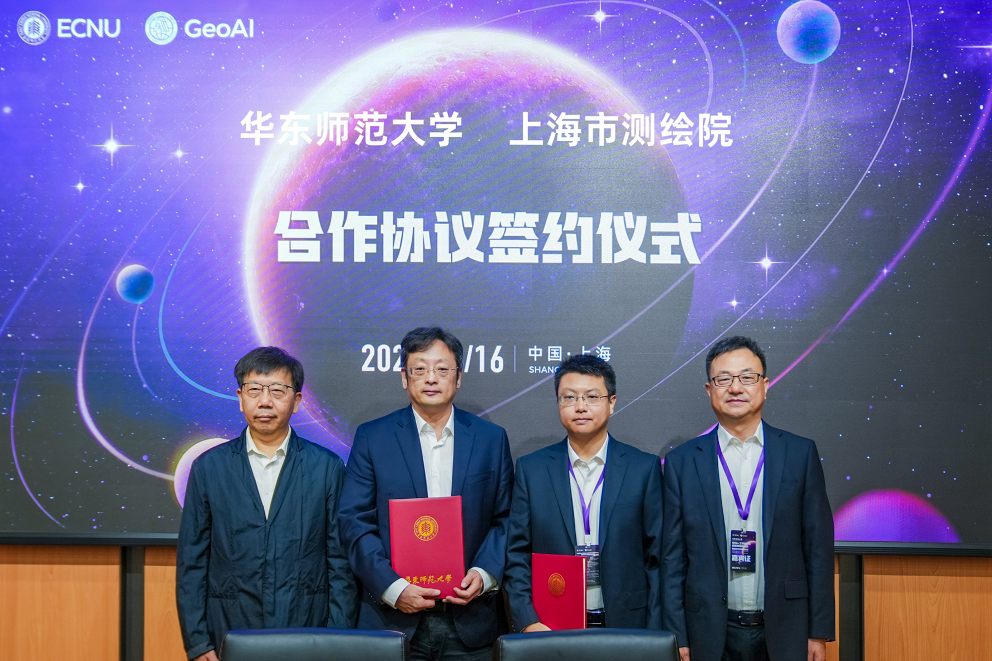 华为云上海总经理张英梗、上海市测绘院科技处处长王伟与学院院长施国跃代表双方分别进行合作签约,华为技术有限公司副总裁、华为云中国区总裁张修征,上海市测绘院副院长赵峰与校长钱旭红院士共同见证