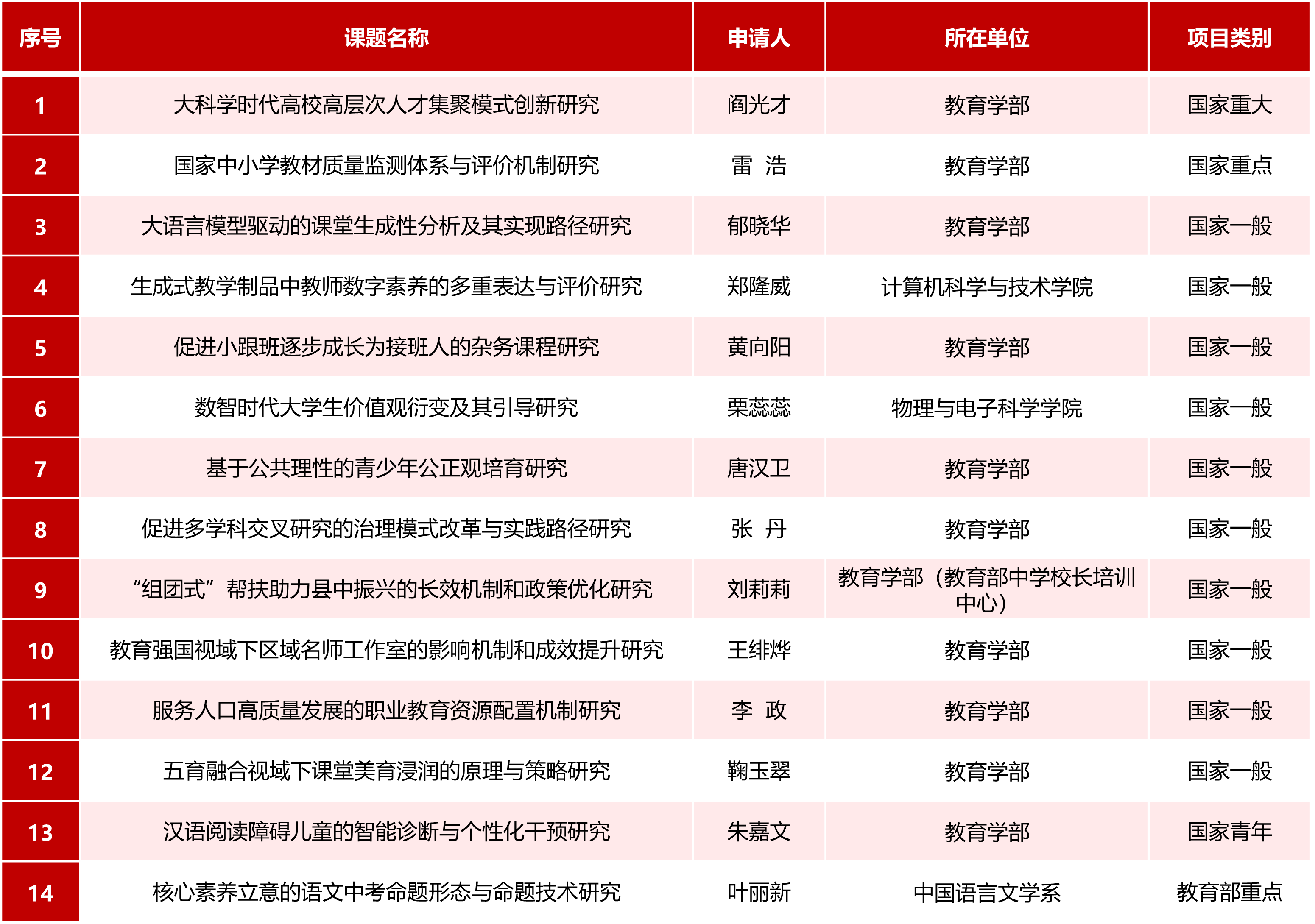 国家社科基金单列学科教育学项目,我校中标国家重点项目1项,国家一般项目10项,国家青年项目1项,另外还中标国家重大项目1项,教育部重点项目1项,立项总数达14项,位居全国并列第3。
