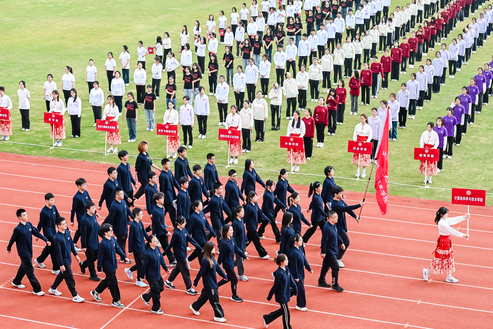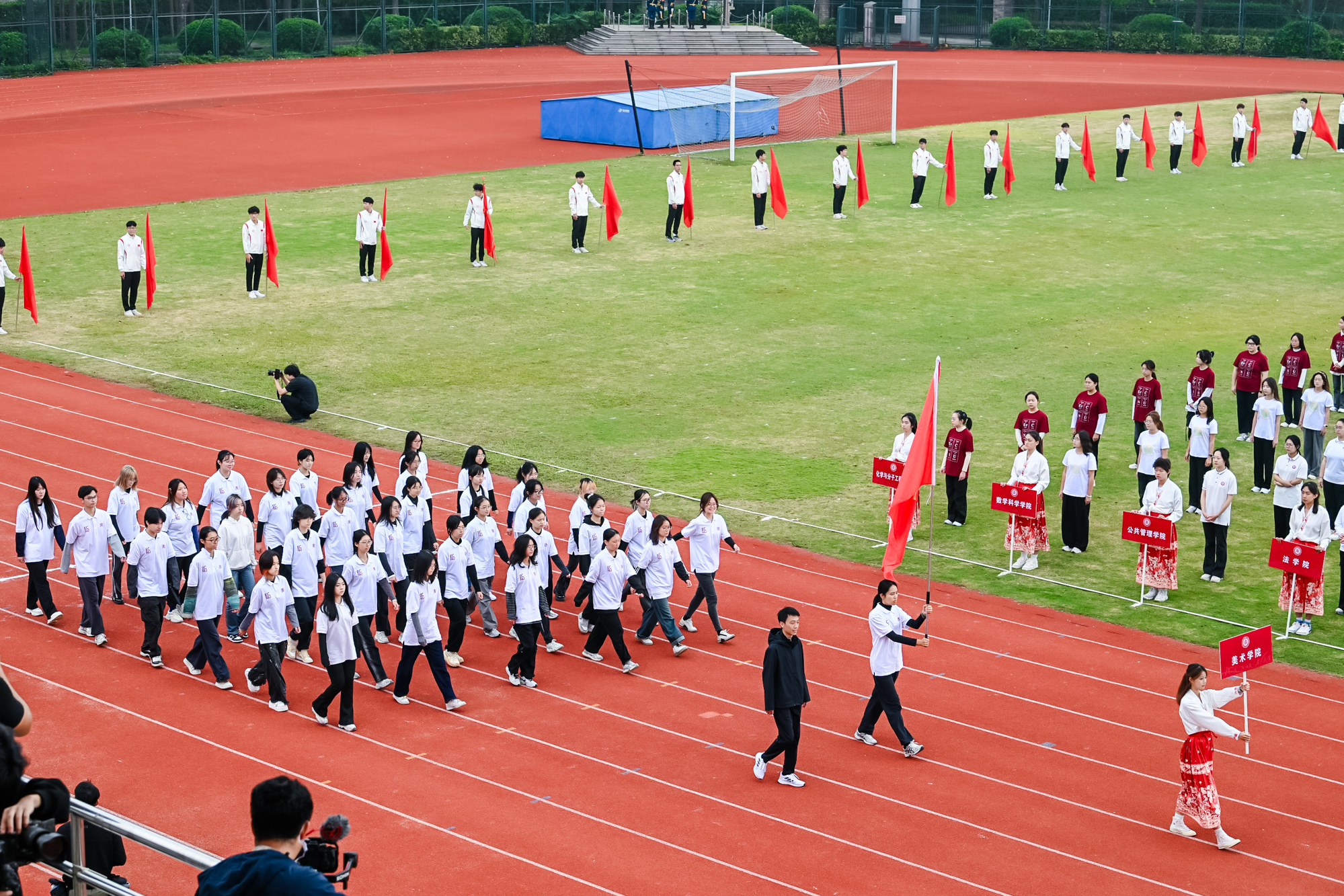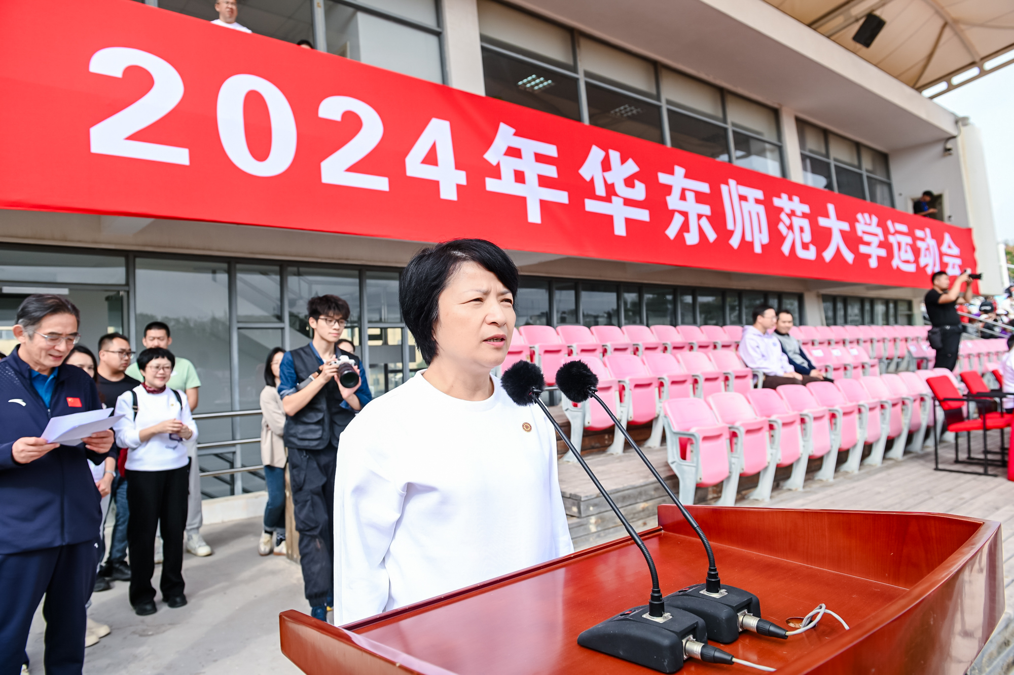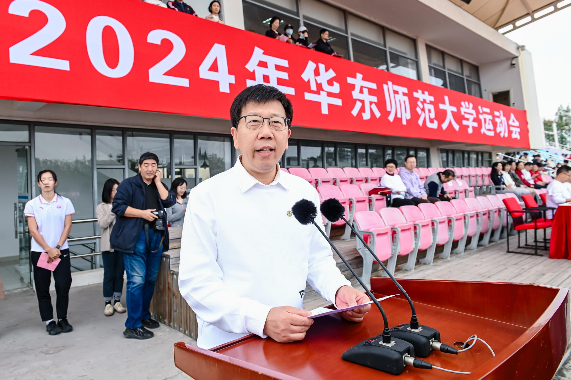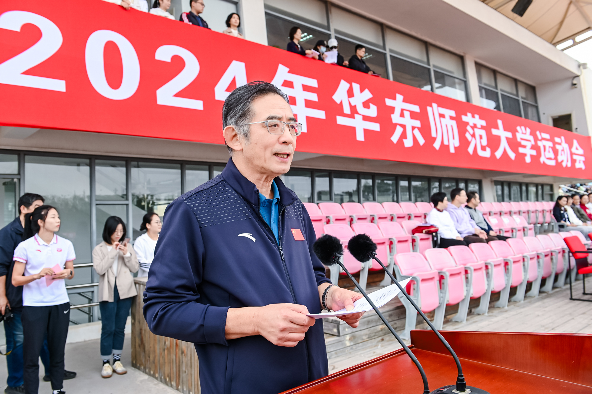 校党委书记梅兵、校长钱旭红、校党委副书记曹友谊、副校长程静等在主席台观摩。开幕式由体育与健康学院院长季浏主持。校党委书记梅兵宣布2024年华东师大运动会开幕。