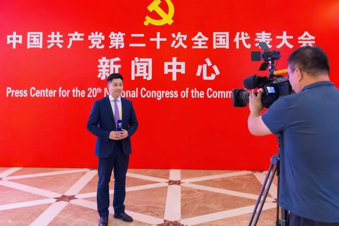2022年10月,2009级校友、江苏广播电视总台融媒体中心主任编辑、出镜记者王尧报道中国共产党第二十次全国代表大会现场