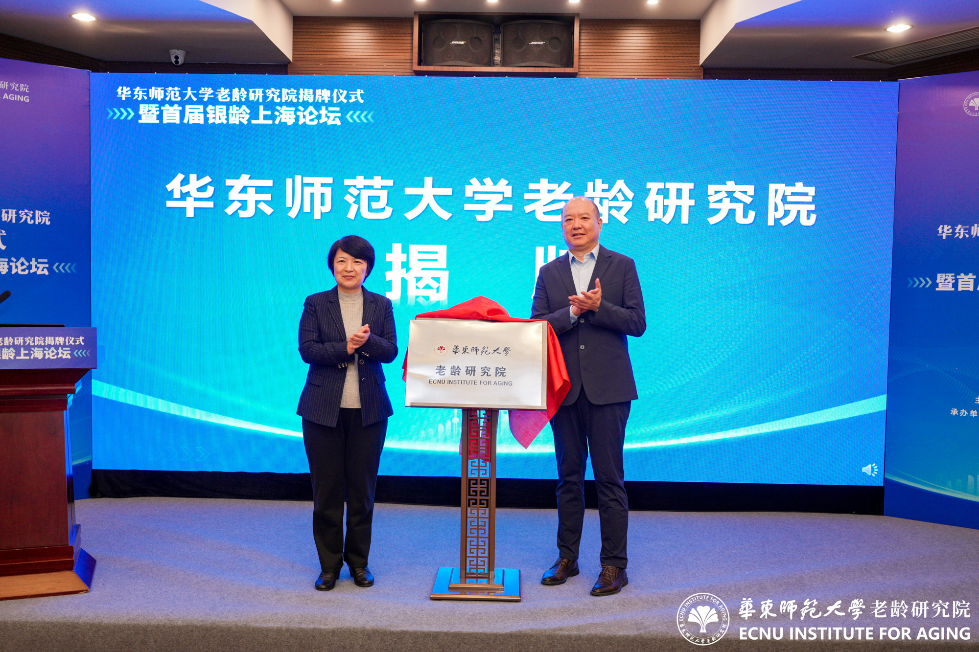上海市养老服务和老龄产业协会会长李勇、澳门永利皇宫官网入口党委书记梅兵共同为澳门永利皇宫官网入口老龄研究院揭牌