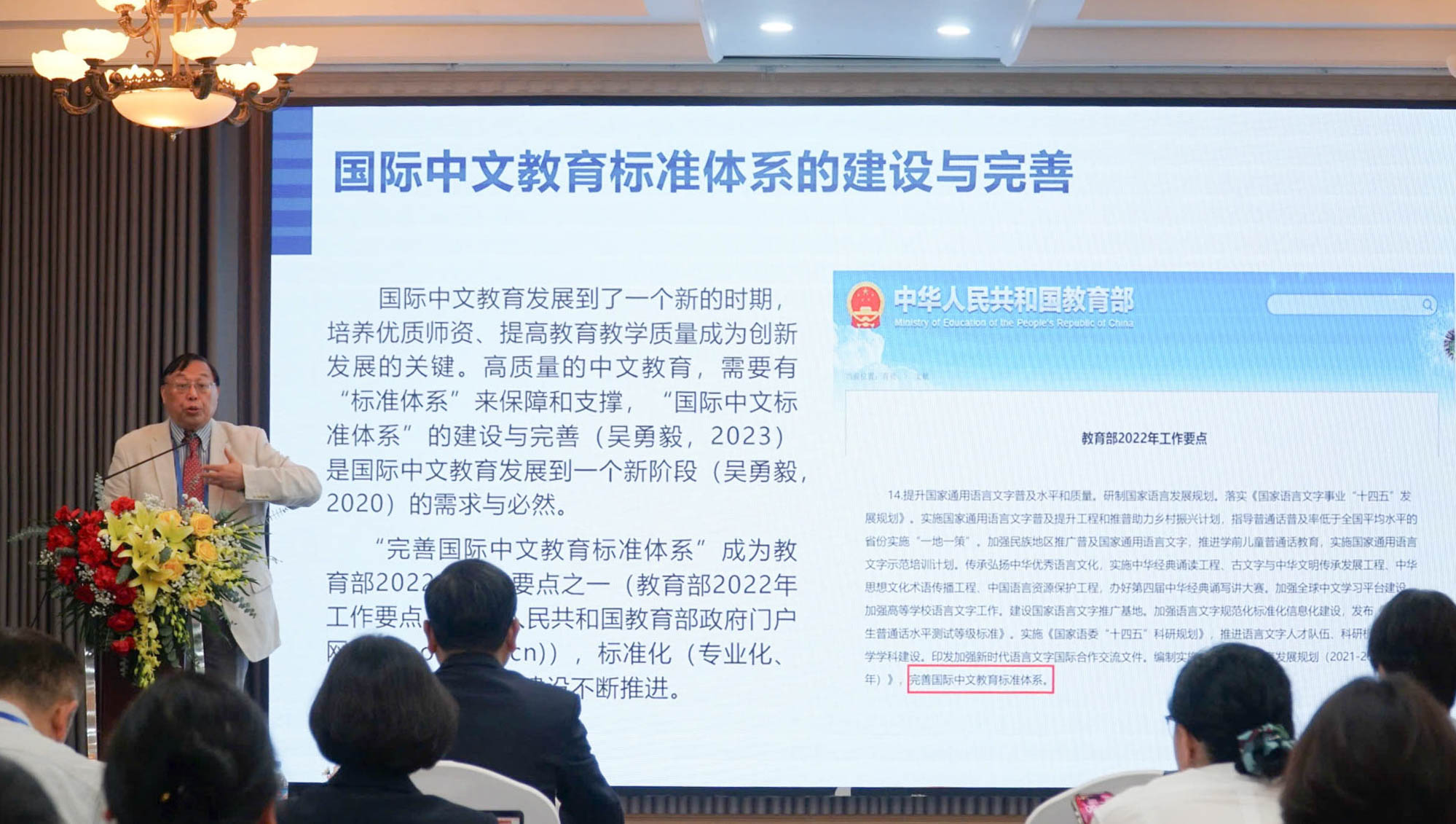 会上,澳门永利皇宫官网入口国际汉语文化学院教授吴勇毅、越南河内国家大学下属外国语大学副教授阮黄英(Nguyen Hoang Anh)、日本大阪大学教授古川裕(Yutaka Furukawa)、越南河内国家大学下属外国语大学副教授阮廷贤(Nguyen Dinh Hien)分别就“《国际中文教师专业能力标准》与教师发展”“越南中小学汉语教学的机遇与挑战”“国际中文教师与‘三教’问题”“越南高校汉语专业课程设置及面临的问题”等主题作主旨报告。主旨报告环节由韩国延世大学研究生院院长金炫哲教授主持。