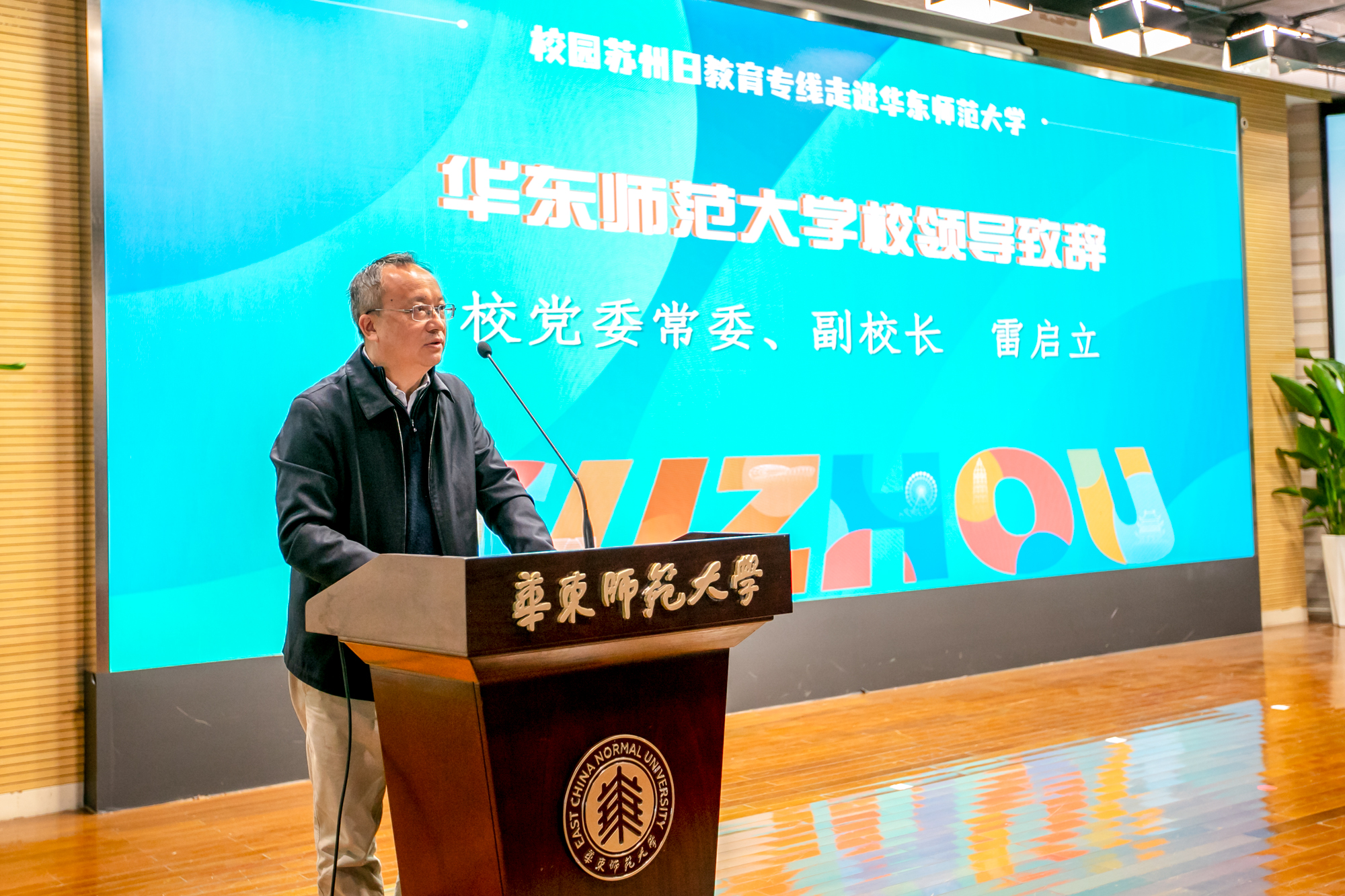 雷启立对苏州市教育系统宣讲团来校表示热烈欢迎。他指出,苏州是一座既拥有悠久历史又洋溢着青春活力的城市。在合作交流方面,苏州与华东师大已建立起长期且紧密的联系,每年均有众多华东师大毕业生选择赴苏州就业,双方合作将为学生提供更多优质就业机会,也将进一步促进苏州教育的发展。