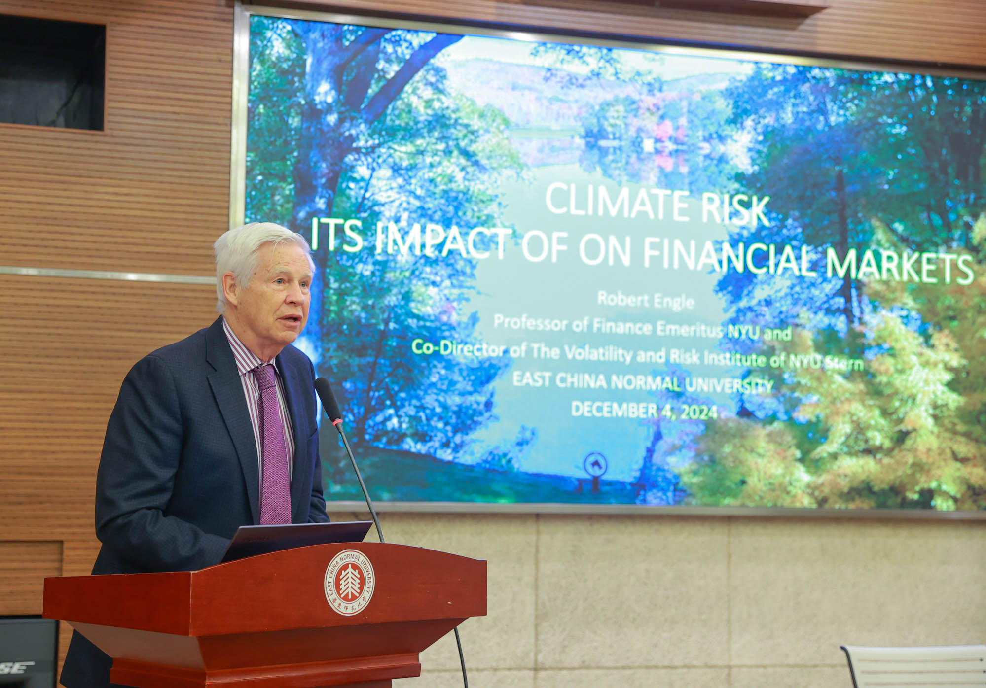 12月4日,诺贝尔经济学奖得主、美国著名计量经济学家、纽约大学斯特恩商学院罗伯特·恩格尔教授(Robert F. Engle)应邀来访华东师大经济与管理学院,并以“气候风险及其对金融市场的影响”为主题为学院师生带来一场精彩的学术讲座。