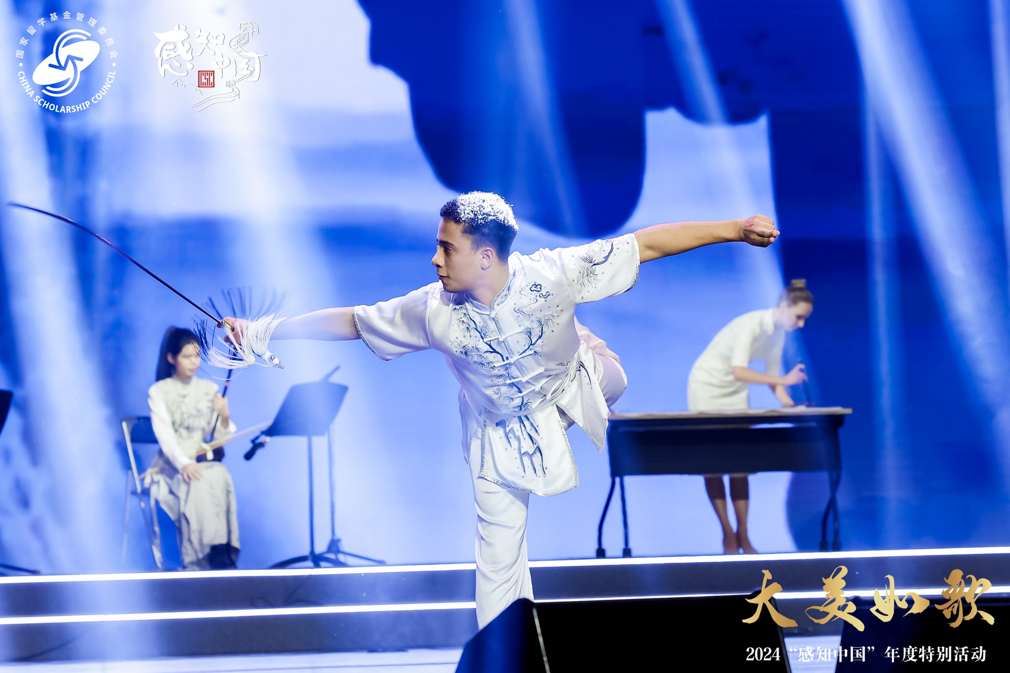 华中师范大学、上海体育大学、上海音乐学院联合表演的《武墨琴韵》通过将琴棋书画和中国武术刀枪棍剑的融合,完美呈现了中华传统文化的一张一弛和刚柔并济。