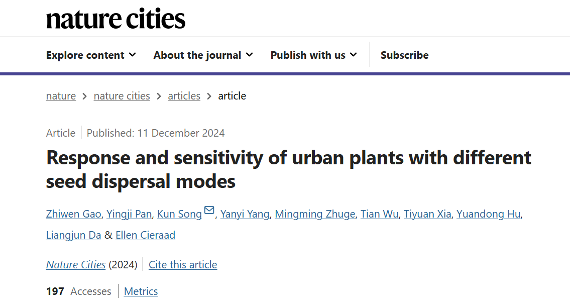 澳门永利皇宫官网入口生态与环境科学学院宋坤研究团队在云南这一生物多样性热点区域的16个主要地级市进行了实地调研,针对城市自生植物种子扩散方式的形成机制这一关键科学问题进行了深入研究,揭示了不同种子扩散方式的城市自生植物物种丰富度的影响因素及其敏感性差异,在城市生态学领域取得重要进展。团队这一发现不仅丰富了对城市植物多样性维持机制的认识,也为城市规划和生态保护提供了新的理论依据。该研究成果以“Response and sensitivity of urban plants with different seed dispersal modes”为题发表于Nature Cities。