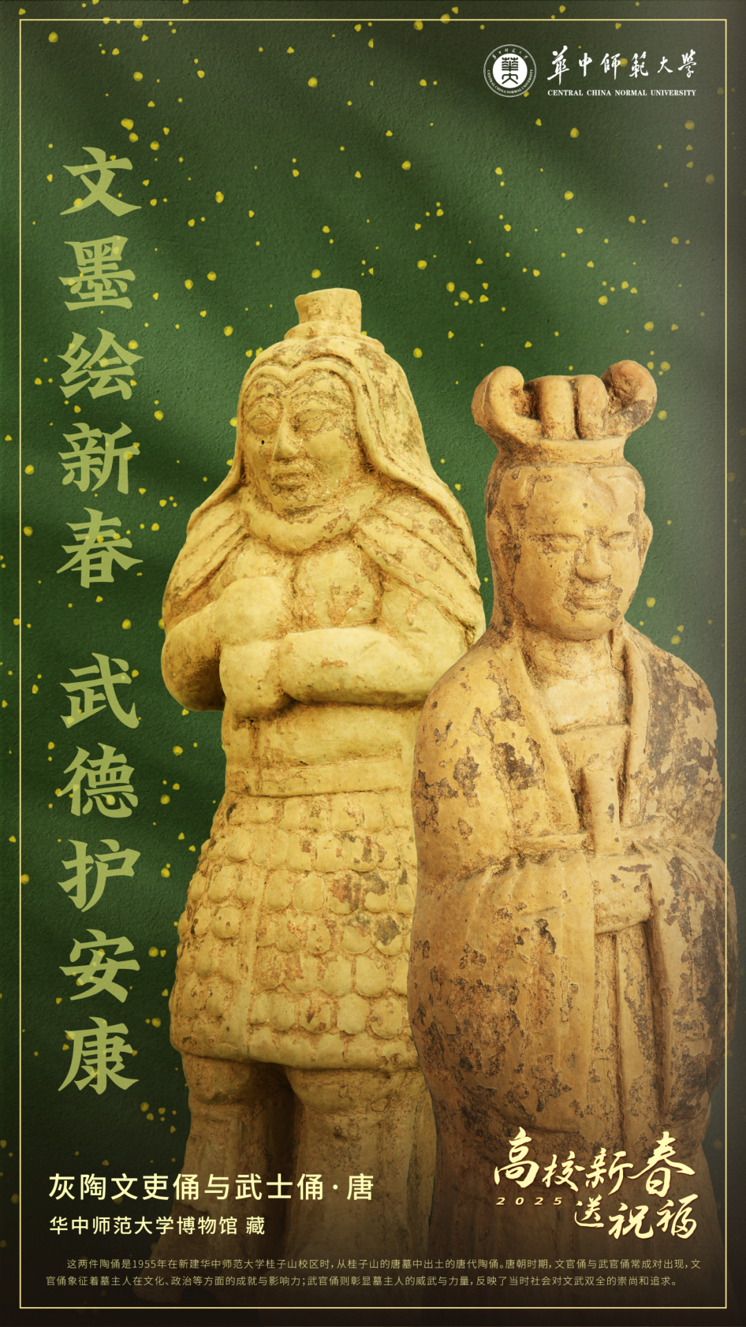 这两件陶俑是1955年在新建华中师范大学桂子山校区时,从桂子山的唐墓中出土的唐代陶俑。唐朝时期,文官俑与武官俑常成对出现,文官俑象征着墓主人在文化、政治等方面的成就与影响力;武官俑则彰显墓主人的威武与力量,反映了当时社会对文武双全的崇尚和追求。
