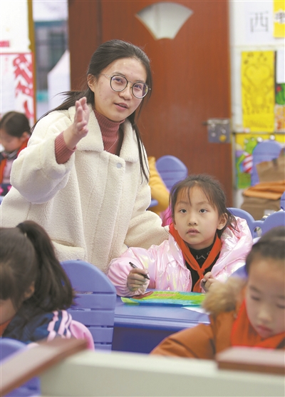 课后延时服务时间,江苏省淮安市天津路小学教师张萌萌指导学生画画。本报记者 张学军 摄