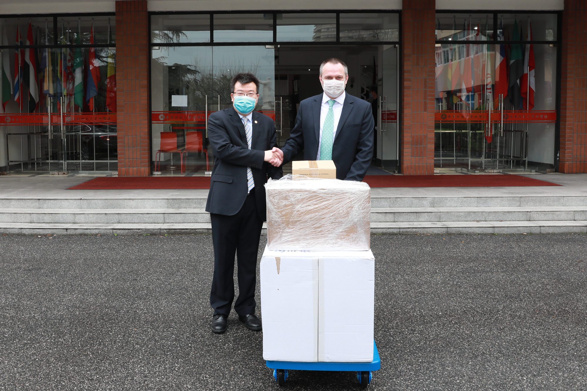 3月26日上午,白俄罗斯共和国驻沪总领馆总领事安德烈·安德烈耶夫一行来到中山北路校区,向我校捐赠了包括医用防护口罩、医用隔离衣、防护服、防护手套在内的一批防疫物资。副校长孙真荣向白俄罗斯驻沪总领馆送出了感...