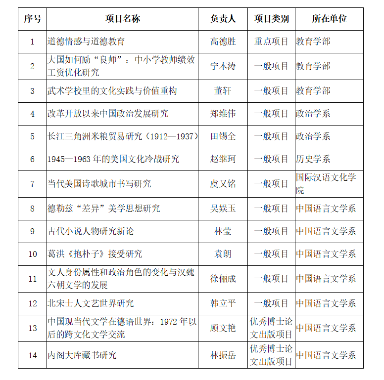 近期,全国哲学社会科学工作办公室公布了2020年度国家社科基金后期资助暨优秀博士论文出版项目立项名单,经专家评审、社会公示并报全国哲学社会科学工作领导小组批准,我校共有14项成果入选,其中中国语言文学系7项,...