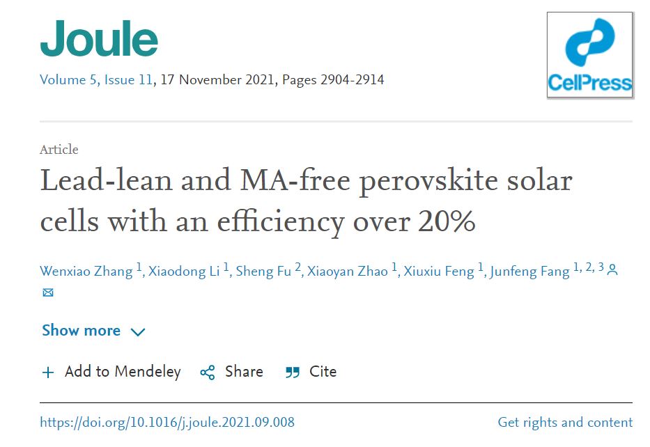 华东师大物理与电子科学学院方俊锋课题组针对高效锡铅钙钛矿电池中毒性铅含量较高这一关键科学问题,提出采用电置换反应法引入还原性铅源的研究思路和解决方案,实现贫铅钙钛矿电池效率和稳定性的同时大幅提升。课题组相关成果以 Lead-lean and MA-free perovskite solar cells with an efficiency over 20% 为题于近期发表在Joule上。该研究以华东师大为第一单位,并与中科院宁波材料所合作完成。张文晓博士后为论文第一作...