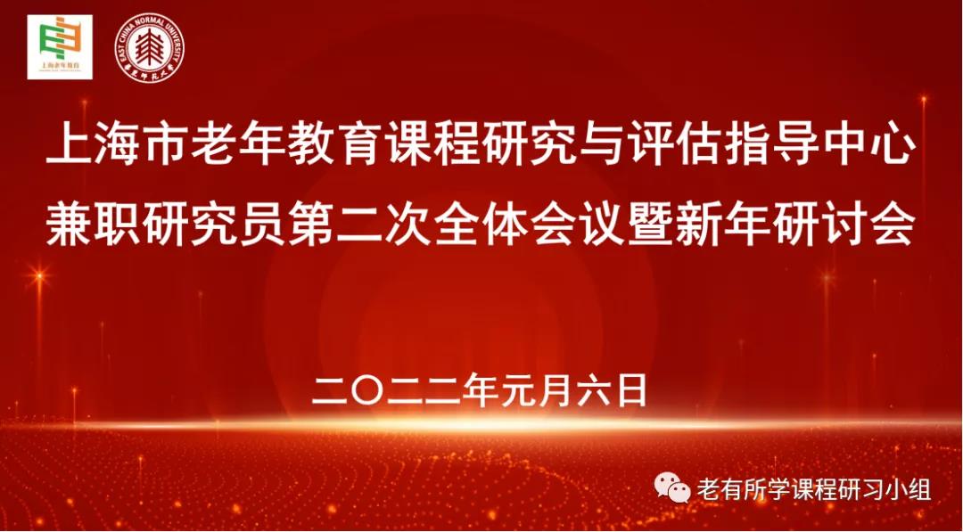 1月6日下午,上海市老年教育课程研究与评估指导中心在华东师大老年大学一楼会议室召开了兼职研究员第二次全体会议暨新年学术研讨会。上海市老年教育课程研究与评估指导中心副主任裴建华、李家成,中心研究室主任张永、马丽华、朱敏、徐敏华,中心成员黄莹、唐迪,以及来自上海开放大学、市老干部大学、各区老年大学(社区学院)和社区(老年)学校的二十余位兼职研究员,以及华东师大职成所的硕博士生参会。本次研讨会由李...