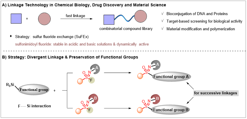 近日,华东师大化学与分子工程学院姜雪峰、王明团队在氟代砜亚胺的调控SuFEx(sulfur(VI)-fluoride exchange)链接方面取得进展。研究团队开发了氟代砜亚胺与TMS-炔的调控SuFEx链接化学,可快速链接高效构建S(VI)-C(sp2)键或S(VI)-C(sp)键。该链接运用硅-氟的强结合能 (BDE = 135 kcal/mol),通过三氟化硼作为氟转移试剂,协同实现S(VI)-F键的断裂和Si-C键的活化。研究成果以“多样性氟代砜亚胺与炔烃SuFEx链接(Divergent ...