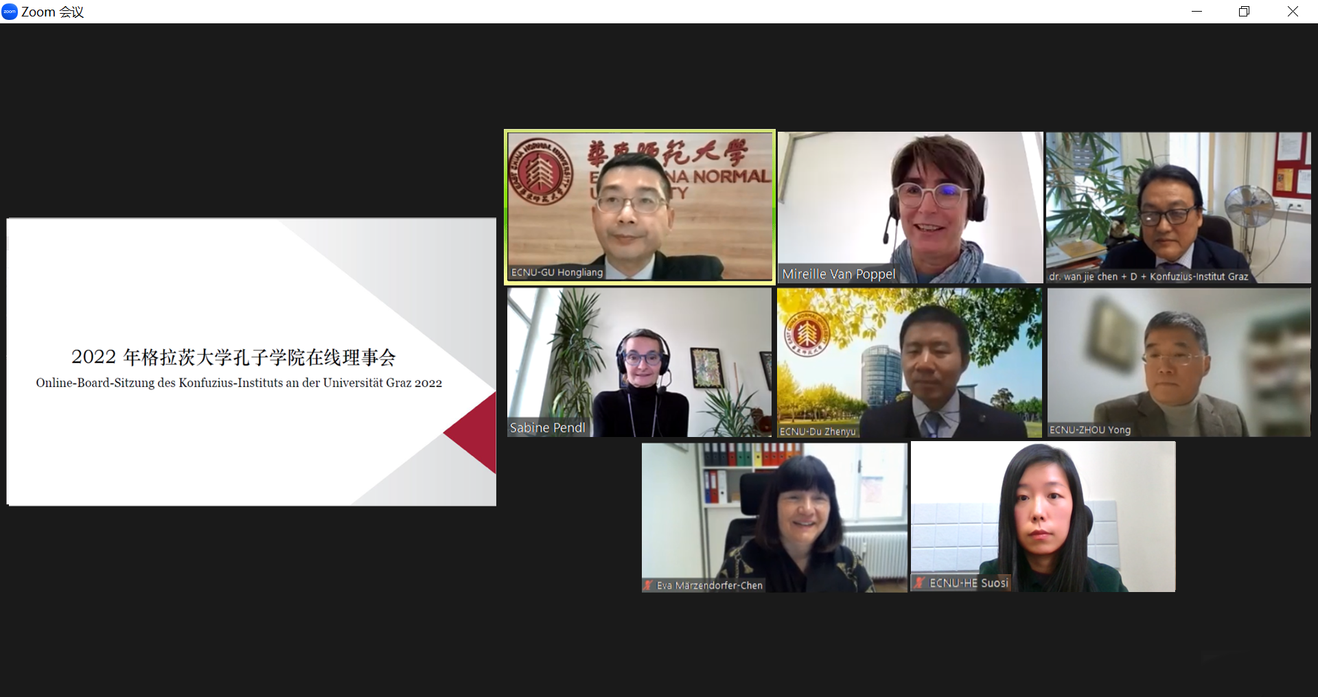 12月21日,华东师大与奥地利格拉茨大学通过线上方式召开格拉茨大学孔子学院理事会。格拉茨大学副校长Mireille van Poppel、国际处负责人Sabine Pendl、孔院外方院长陈万杰、孔院外方副院长Eva Märzendorfer-Chen出席会议,华东师大副校长顾红亮、国际合作与交流处处长杜震宇、孔子学院工作办公室主任周勇参会,国际合作与交流处工作人员列席会议。 会议期间,Mireille van Poppel副校长表示,非常高兴看到两校共建格拉茨...