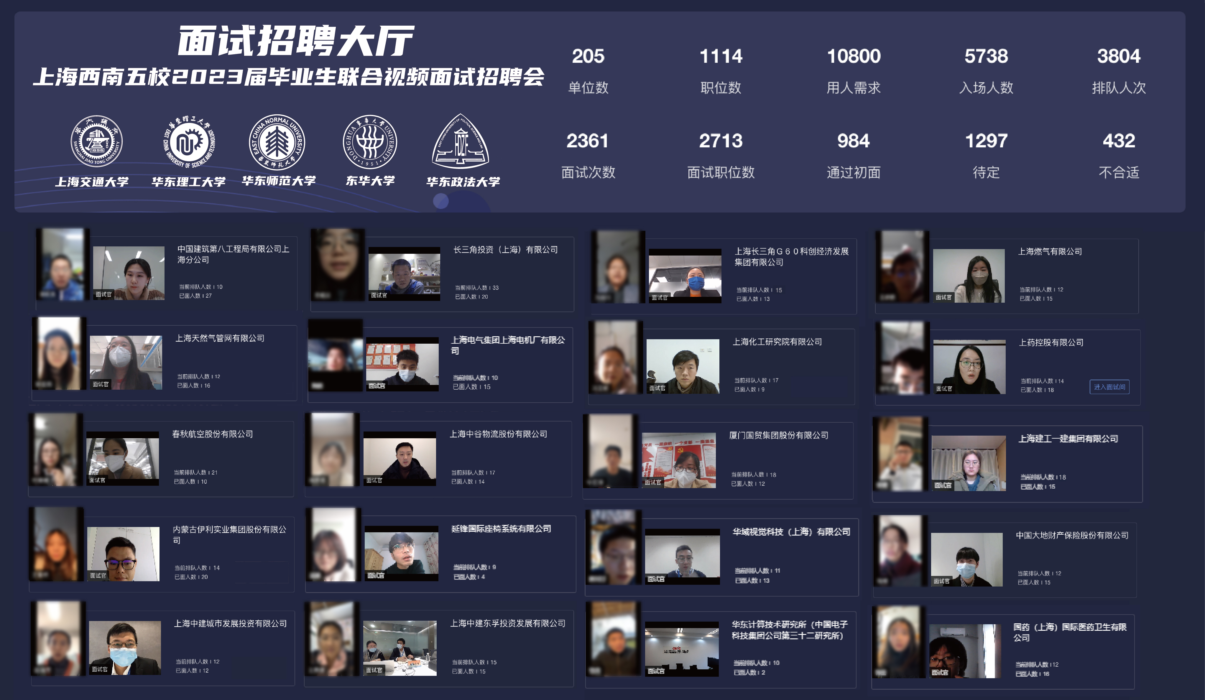 12月27日,上海西南五校2023届毕业生“名校名企优才”视频双选会在线举行。该招聘会由上海交大、华东理工、华东师大、东华大学、华东政法等上海西南片五所高校联合主办,已连续举办22年,参会毕业生累计超过25万人次,成为上海市应届毕业生校园招聘的重要品牌活动之一。上海西南五校2023届毕业生“名校名企优才”视频双选会在线举行 本次毕业生“名校名企优才”视频双选会是研究生招考后面向五校学子的首场线上招聘会,...