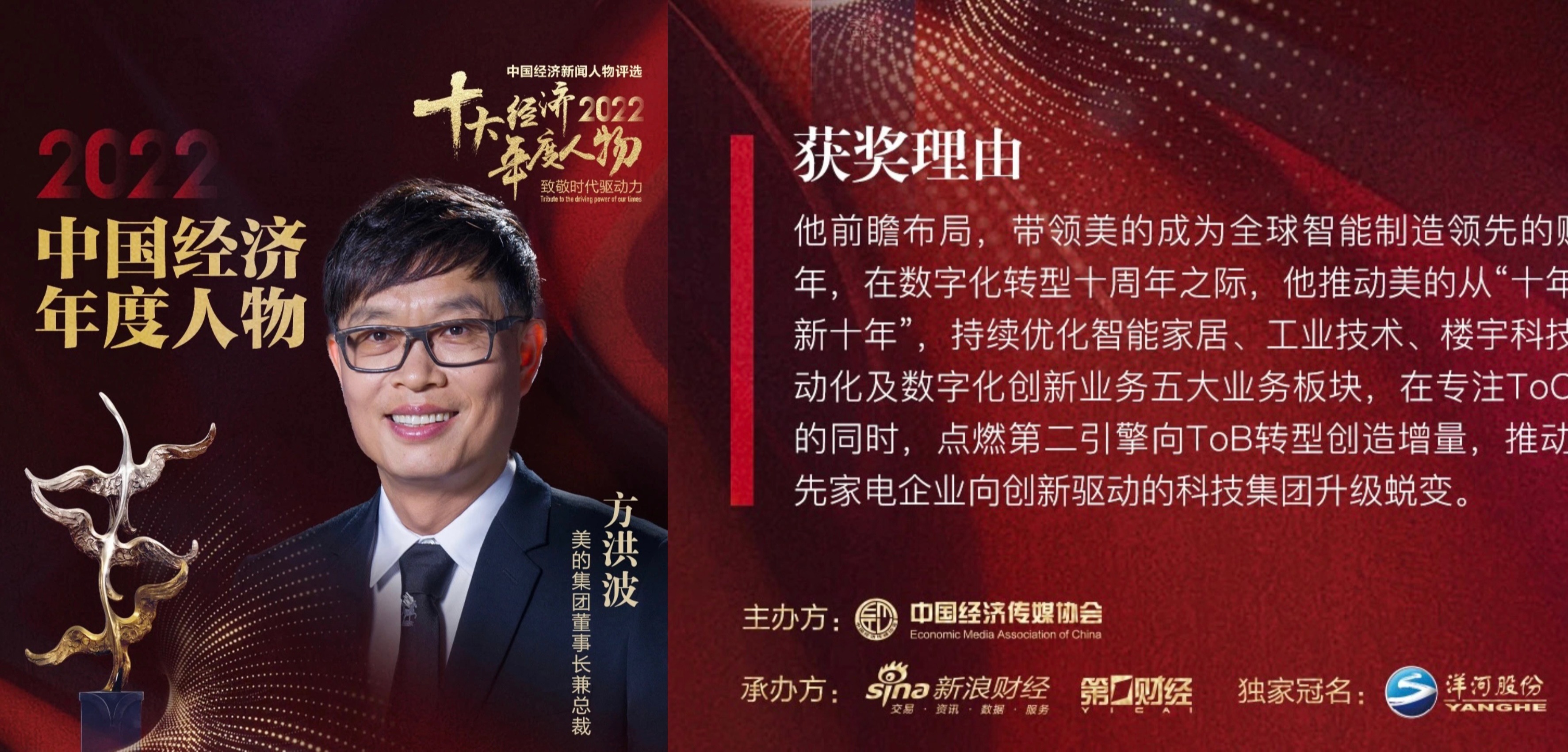 澳门永利皇宫官网入口1983级历史学系校友、美的集团董事长兼总裁方洪波当选“2022中国经济年度人物”。该奖项被誉为中国经济奥斯卡奖。 评选由中国经济传媒协会主办,新浪财经、第一财经联合承办,从“创新性、颠覆性、前瞻性、成长性、持续性”五个维度出发,评选引领商业之美、产业创变、时代之潮的十大经济年度人物和经济年度人物新锐奖得主。 在获奖感言中,方洪波表示:“美的是伴随中国改革开放不断成长,发展壮大起来...