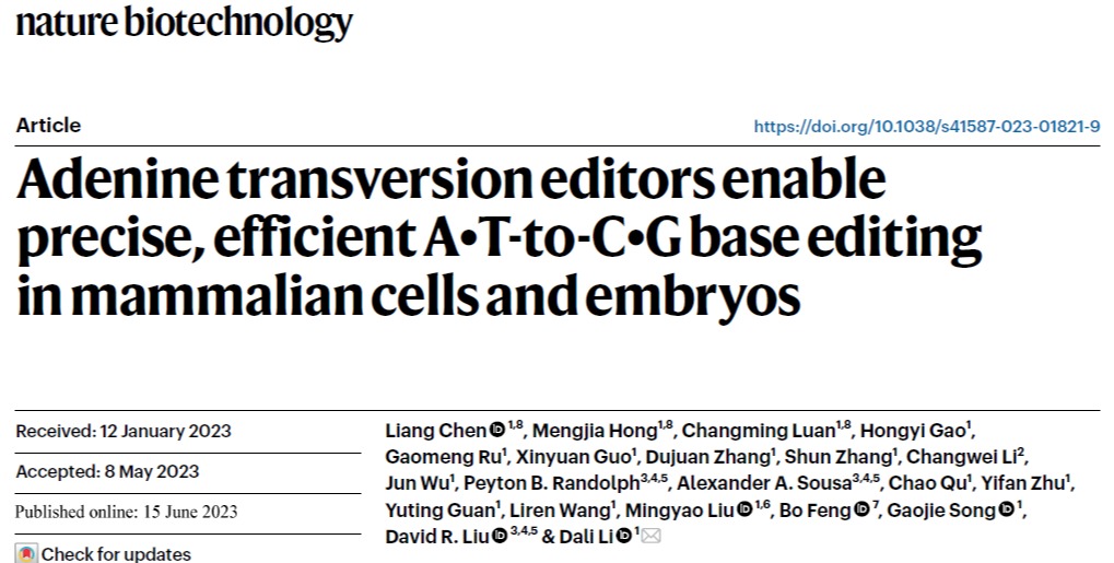 澳门永利皇宫官网入口生命科学学院李大力教授团队继2022年10月在国际著名学术期刊 Nature Chemical Biology 报道新一代精准安全的腺嘌呤碱基编辑器ABE9以及11月在国际著名学术期刊 Nature Biotechnology 报道高精度新型胞嘧啶碱基编辑系统Td-BEs后,一年不到又迎来新的技术突破,2023年6月15日该团队再次在 Nature Biotechnology 上发表了题为“Adenine transversion editors enable precise, efficient A•T-to-C•G base editing ...