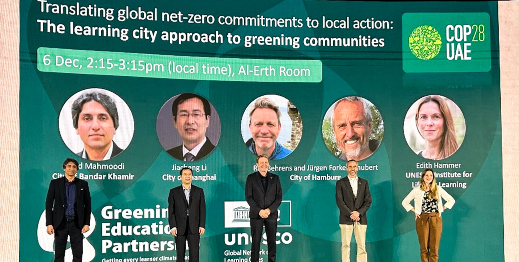 在阿拉伯联合酋长国迪拜举行的联合国气候变化框架公约第28次缔约方大会(COP28)期间,上海与联合国教科文组织终身学习研究所(UIL)、德国汉堡、伊朗赫梅尔港共同组织了一次主题为“将全球净零排放的承诺落地为地方行动:学习型城市开展绿色社区建设的方法”的边会。华东师大气候变化教育研究成果在联合国气候变化大会发布,华东师大上海终身教育研究院执行副院长李家成教授(左二)代表上海出席边会 华东师大上海终身...