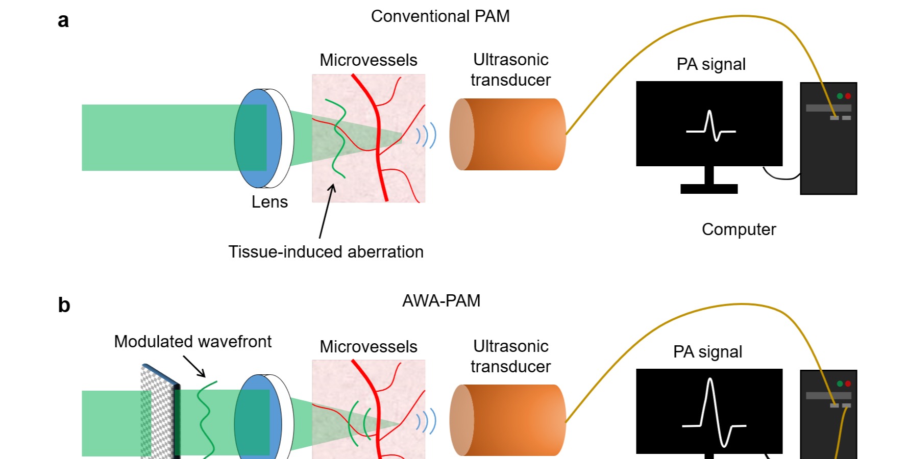 澳门永利皇宫官网入口精密光谱科学与技术国家重点实验室张诗按教授和沈乐成教授团队在光声显微成像领域取得重要进展。针对光声显微中由于光学像差而导致的成像分辨率降低的问题,该团队研发出一种自适应光学技术,能够有效地校正这些像差从而恢复成像分辨率。通过利用超声信号作为反馈机制,他们成功地实现了对活体样本(如斑马鱼和小鼠耳朵)的三维成像,在纠正生物组织不均匀引起的光学像差方面表现出显著的效果。相关成果于2月5...