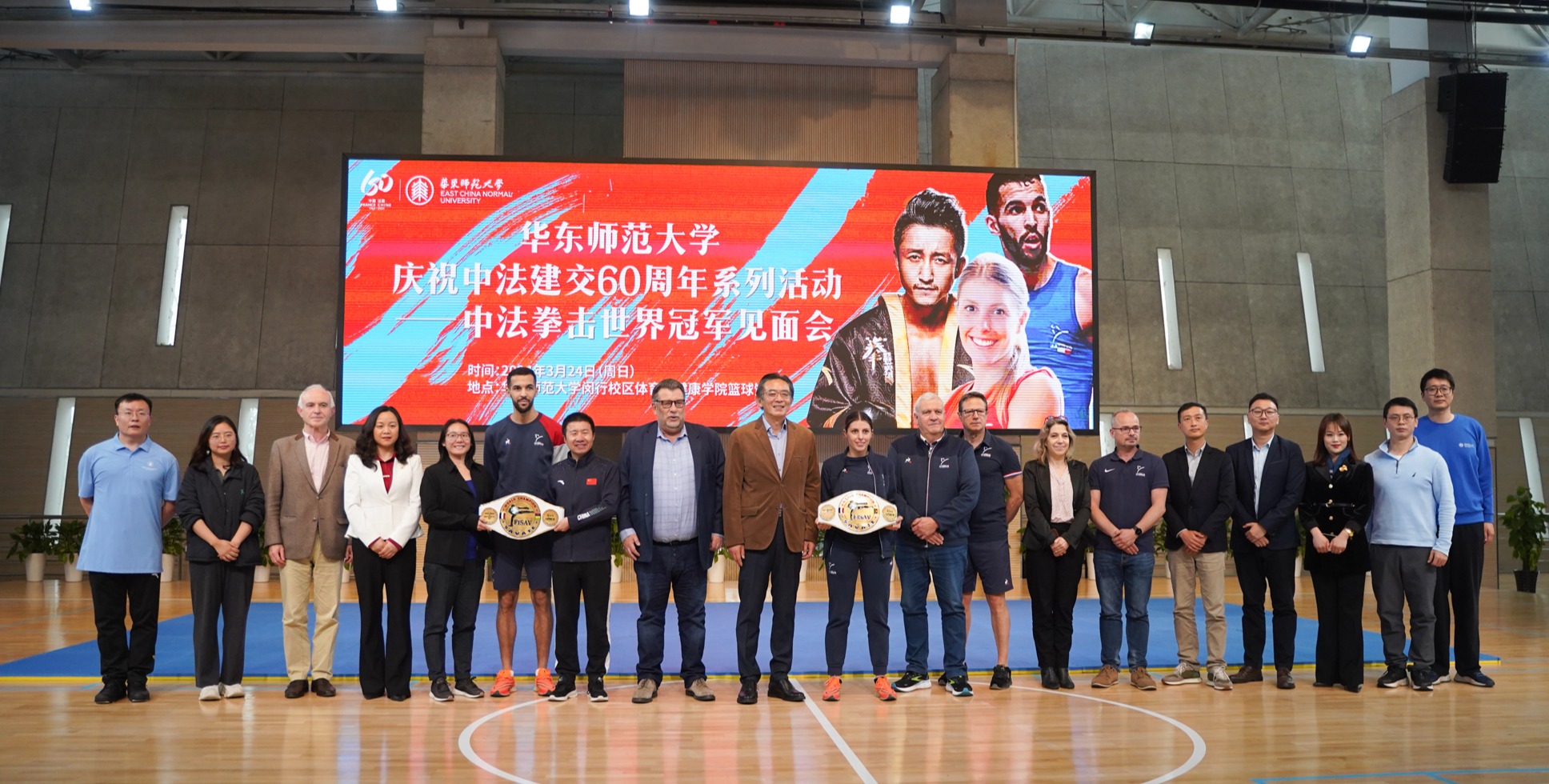 3月24日下午,法式拳击冠军代表团到访华东师大,中法拳击世界冠军见面会在闵行校区篮球馆举行,1000人的观众席座无虚席,活动精彩纷呈。这是华东师大庆祝中法建交60周年系列活动的首场活动。这场盛会不仅引领大家领略拳击运动的魅力,更旨在深化中法两国在体育领域的交流与合作。 法式拳击冠军代表团到访华东师大开场表演 该活动由华东师大体育与健康学院、国际合作与交流处主办,并得到了法国驻上海总领事馆的大力支持...