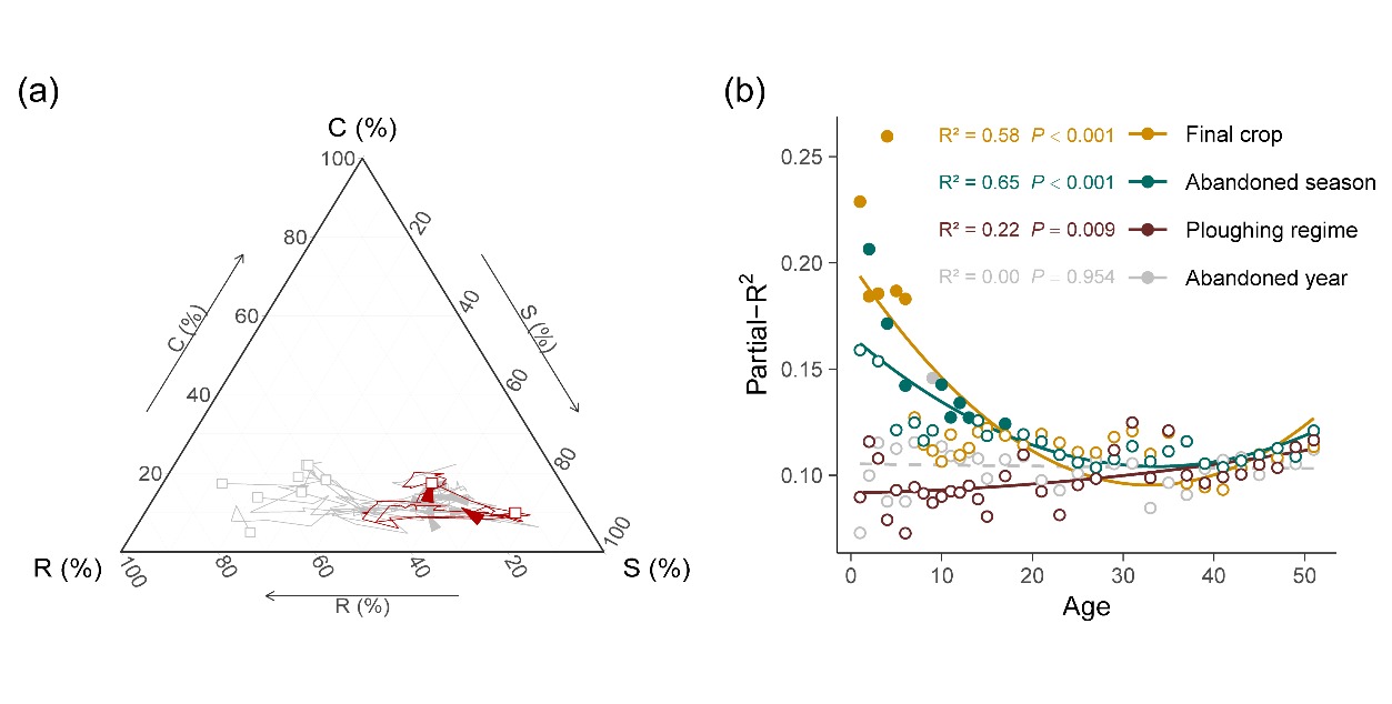 1974年,Philip Grime开创性地提出植物存在竞争型(competitors, C)、耐胁迫型(stress-tolerators, S)和杂草型(ruderals, R)三种基本生态适应策略(即CSR理论),这一理论被认为是现代植物功能生态学的开端和基石。Grime依据CSR理论预测,植物群落在次生演替进程中会由早期的杂草型策略(R策略)向演替后期的耐胁迫型策略(S策略)转变。这一经典预测被广泛接受,但尚缺乏长期连续数据的有效验证。 2024年5月30日,...