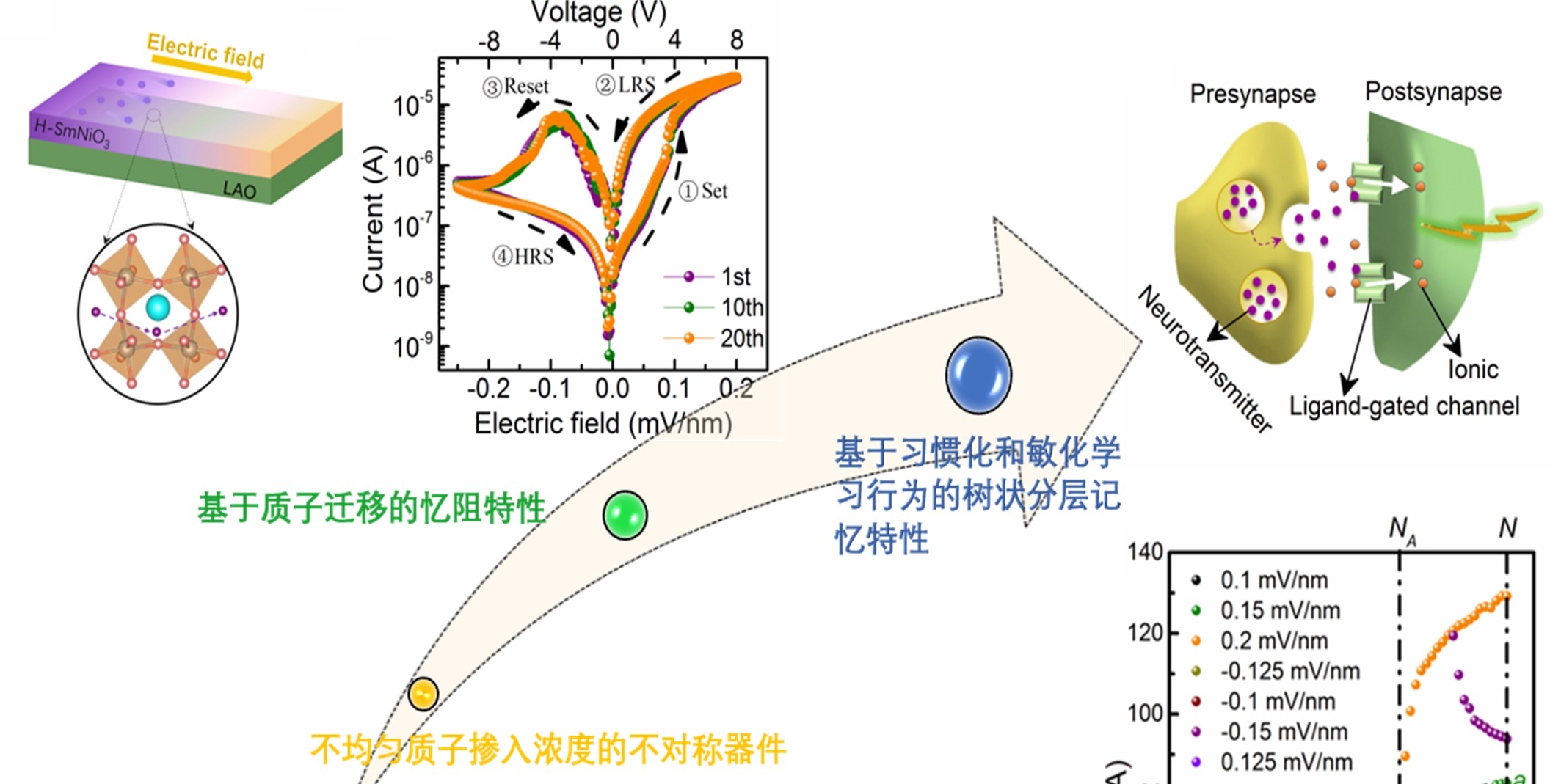 近期,澳门永利皇宫官网入口极化材料与器件教育部重点实验室、上海类脑与智能材料与器件研究中心段纯刚教授、向平华教授、钟妮教授科研团队在神经形态人工突触器件研究中取得重要进展。利用氢质子在关联氧化物量子材料中的空间演化实现了生物突触中基于习惯化和敏化学习行为的树状分层记忆特性,为开发具有自我学习和联想记忆能力的人工智能硬件提供了新思路。 研究成果以“Spatial evolution of the proton-coupled Mott transi...