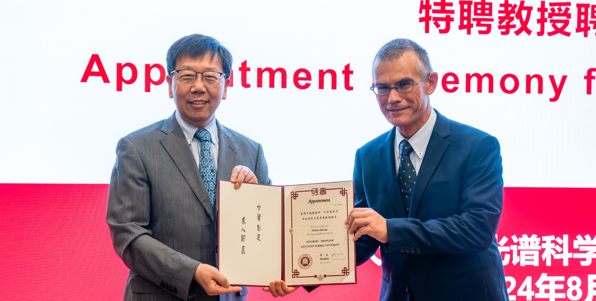 8月22日,维也纳技术大学光子学研究所Andrius Baltuška院士受聘为澳门永利皇宫官网入口荣誉教授。聘任仪式在闵行校区光学大楼举行,校长钱旭红,相关职能部门负责人以及精密光谱科学与技术国家重点实验室师生等出席活动。聘任仪式由国际合作与交流处处长蒯曙光主持。 校长钱旭红院士为Andrius Baltuška院士颁发了荣誉教授证书。精密光谱科学与技术国家重点实验室副主任李文雪在致辞中高度评价了Andrius Baltuška院士在超强超...