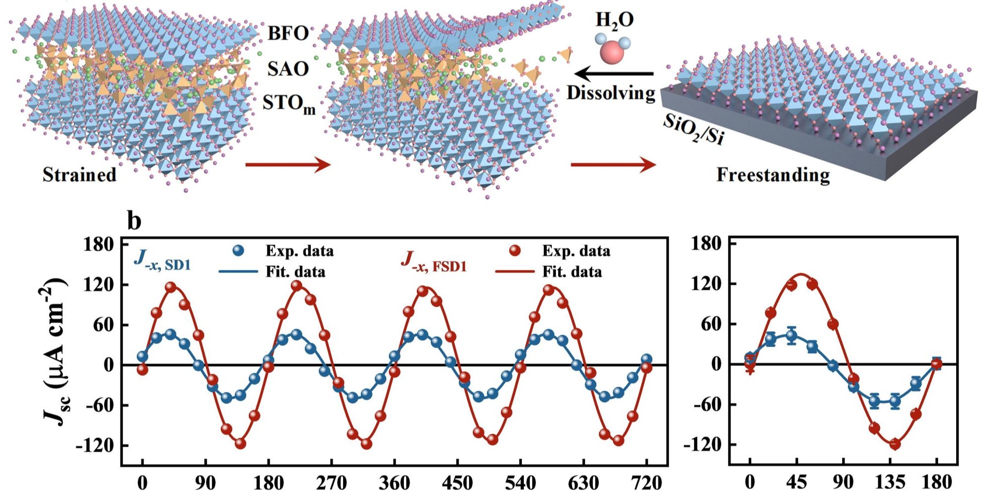 体光伏效应(Bulk Photovoltaic Effect)是一种存在于非中心对称材料中的新型光伏效应。体光伏效应具有偏振光的角度分辨性以及突破pn结光伏电池Shockley-Queisser理论极限的潜力,这些独特优势使得体光伏效应成为光伏领域的研究前沿和热点。另一方面,自支撑氧化物薄膜是一种将外延氧化物薄膜从衬底剥离后独立存在的薄膜形态。由于摆脱了衬底应力约束,自支撑氧化物薄膜已展现出超弹性、单层铁电性、铁电拓扑和挠曲电光伏耦...